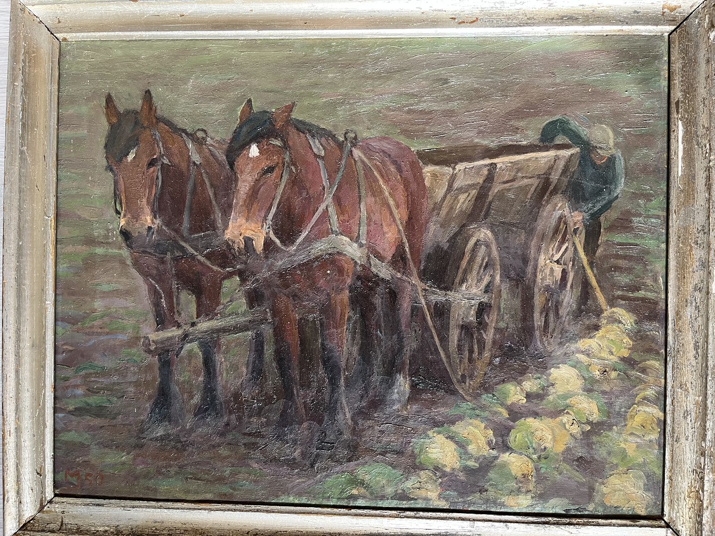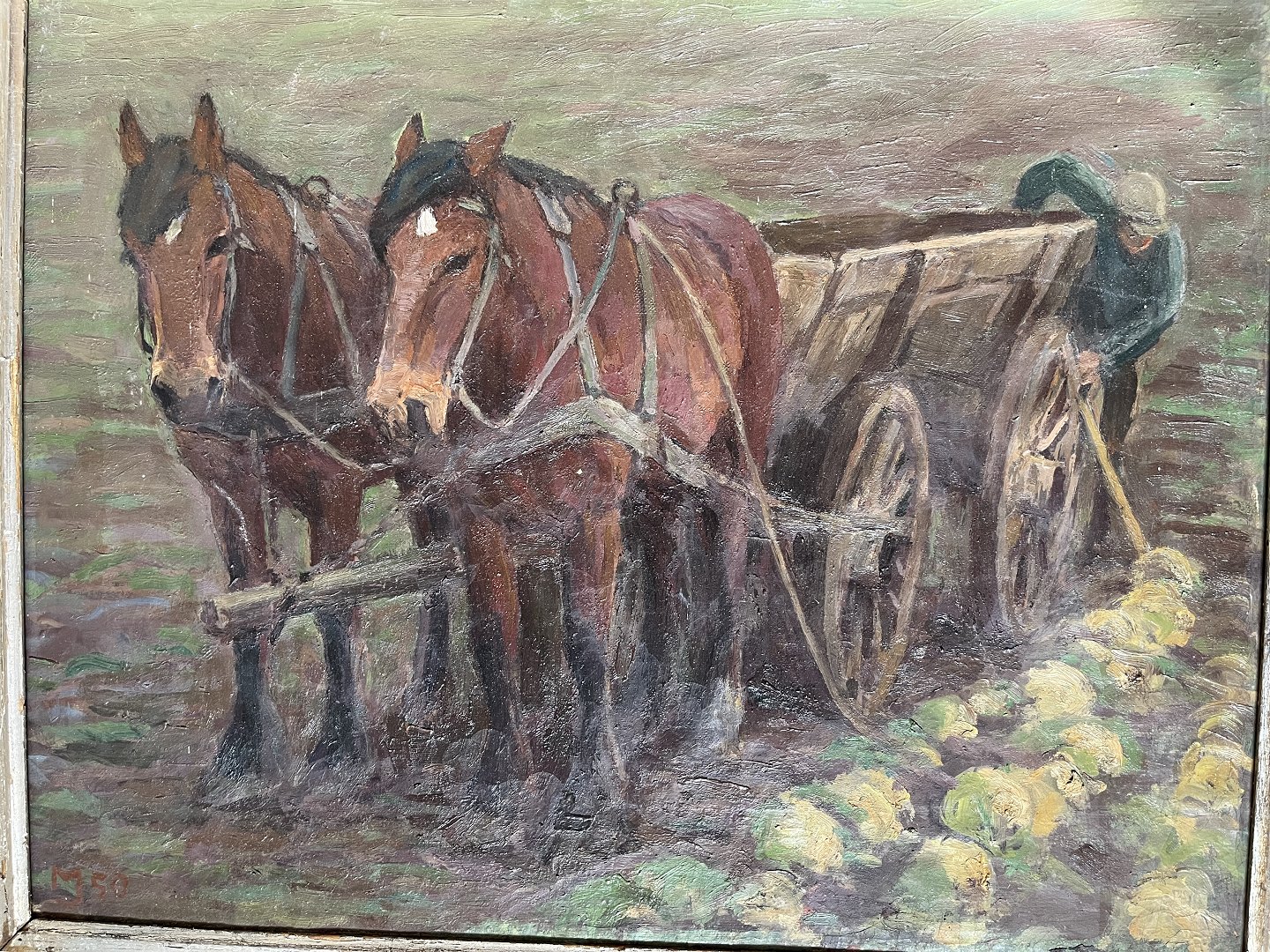 Text available in Danish: Maleri af Marius Jensen Hindevad - Kål høsten bringes i hus 1950