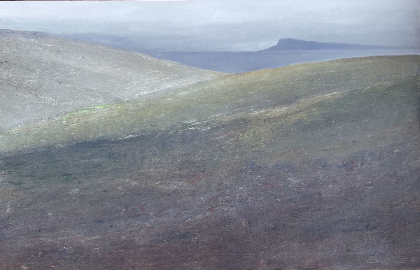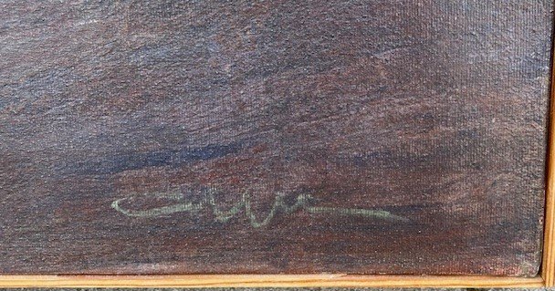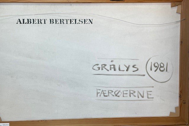 "Grey Light Faroe Islands" beautiful oil painting in original condition, however with cracks in the sky, Light natural frame.