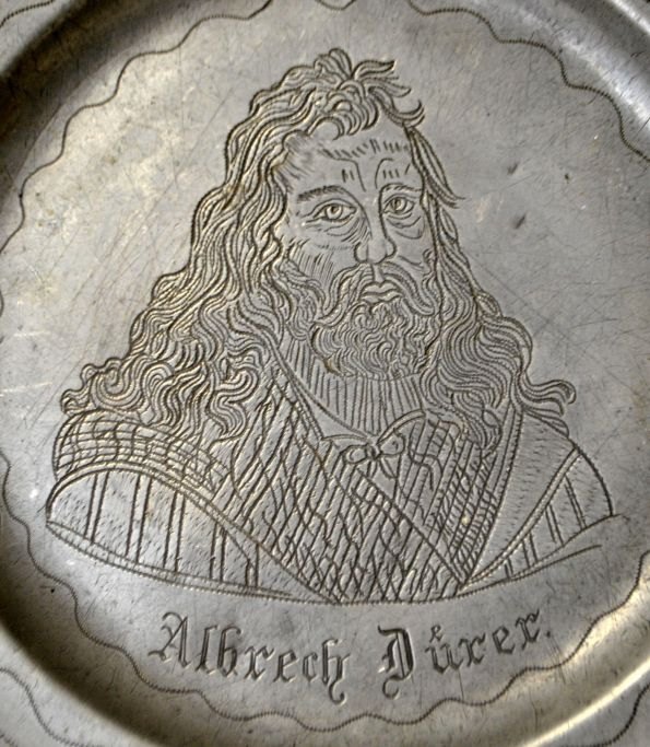 Pewter plate with Albrecht Dürer, 19th century Germany.