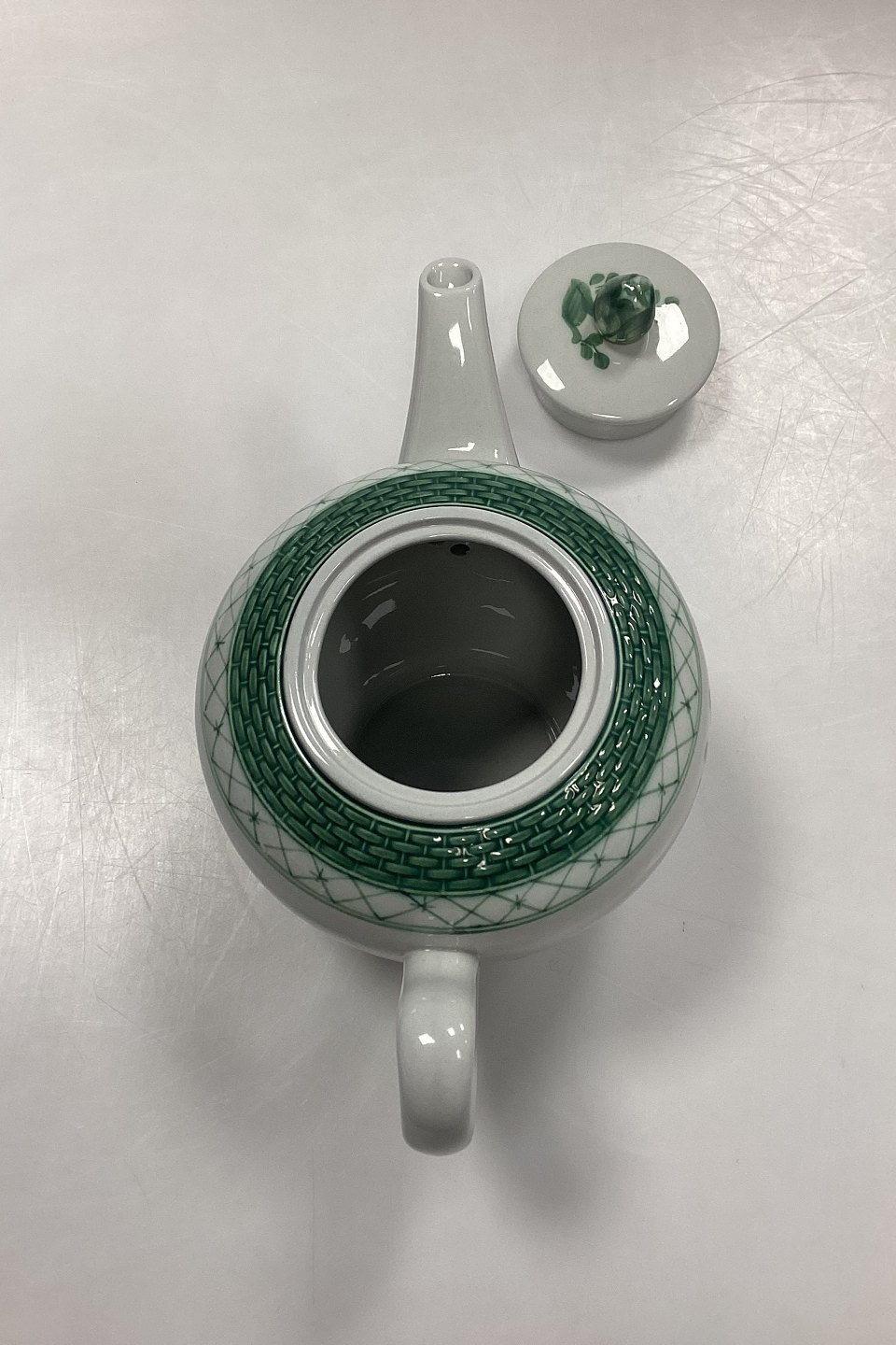 Royal Copenhagen Green Tranquebar Teapot No. 1106. Measures 15 cm x 25 cm / 5.91 in. x 9.85 in.