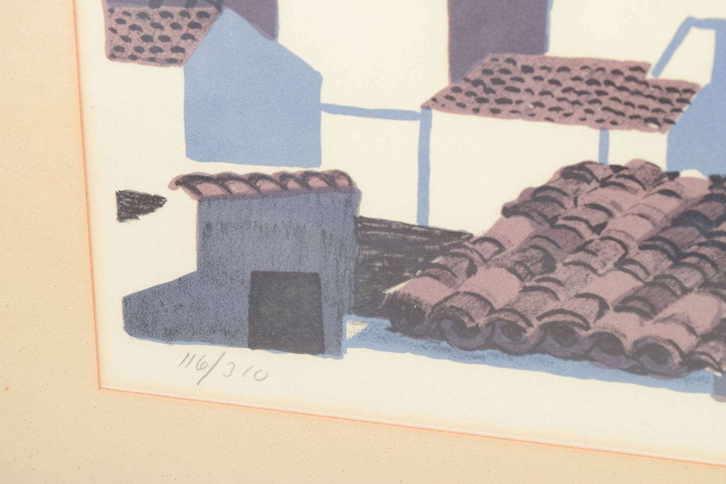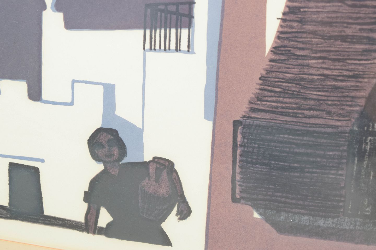 Graphic composition with stylised architectural forms and figurative elements executed as a colour lithograph, signed in pencil and numbered 116/310.