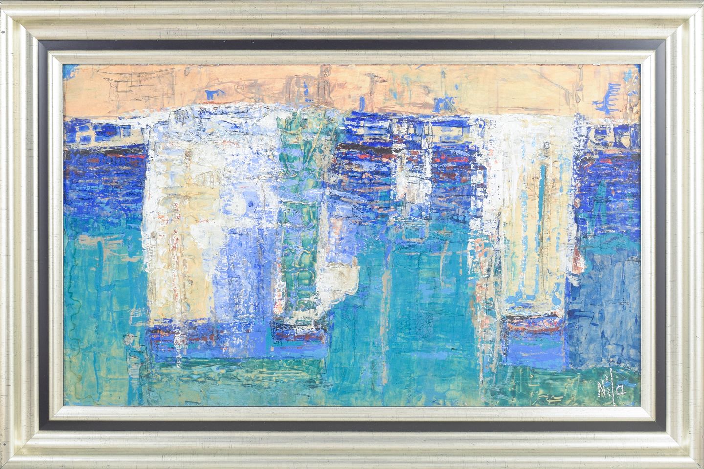 Abstract composition executed in oil on board with textured brushwork and a nuanced palette dominated by blue and turquoise tones. Signed.