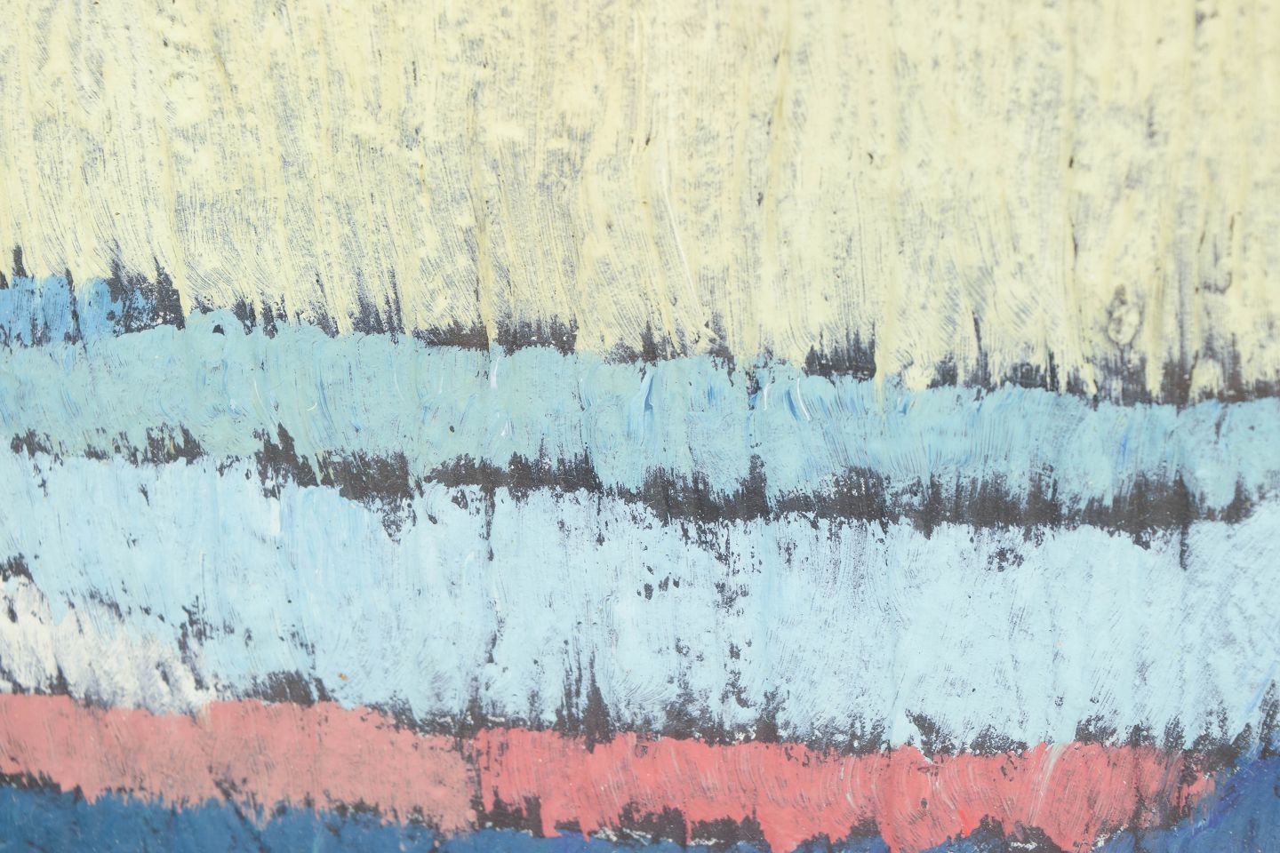 Abstract landscape composition executed in oil on paper with broad, textured brushstrokes in blue, white and green tones with a horizontal band in a reddish hue. The composition has a clear horizontal structure suggesting a stylised sea or coastal landscape.