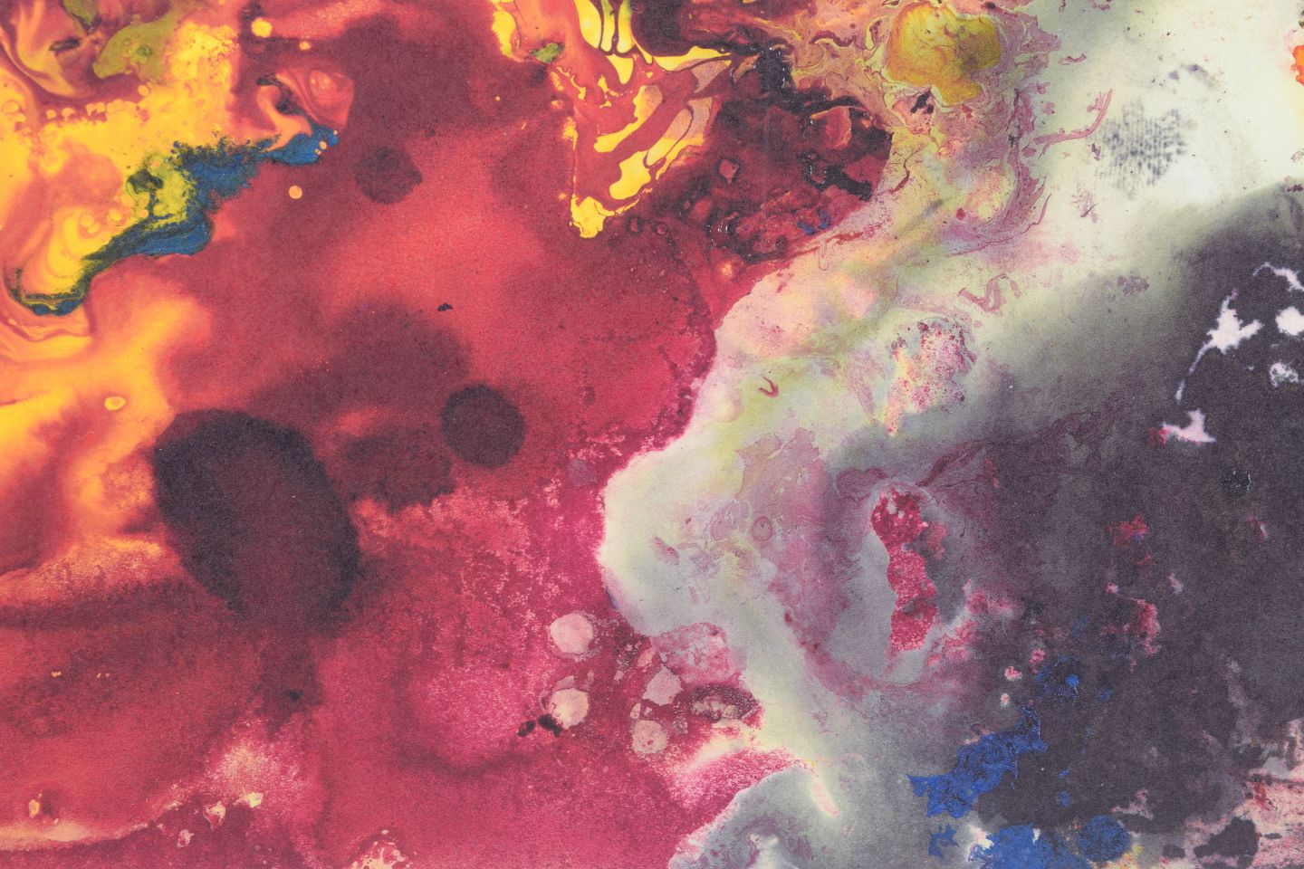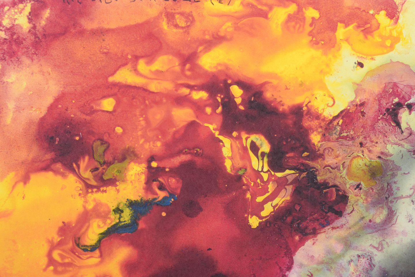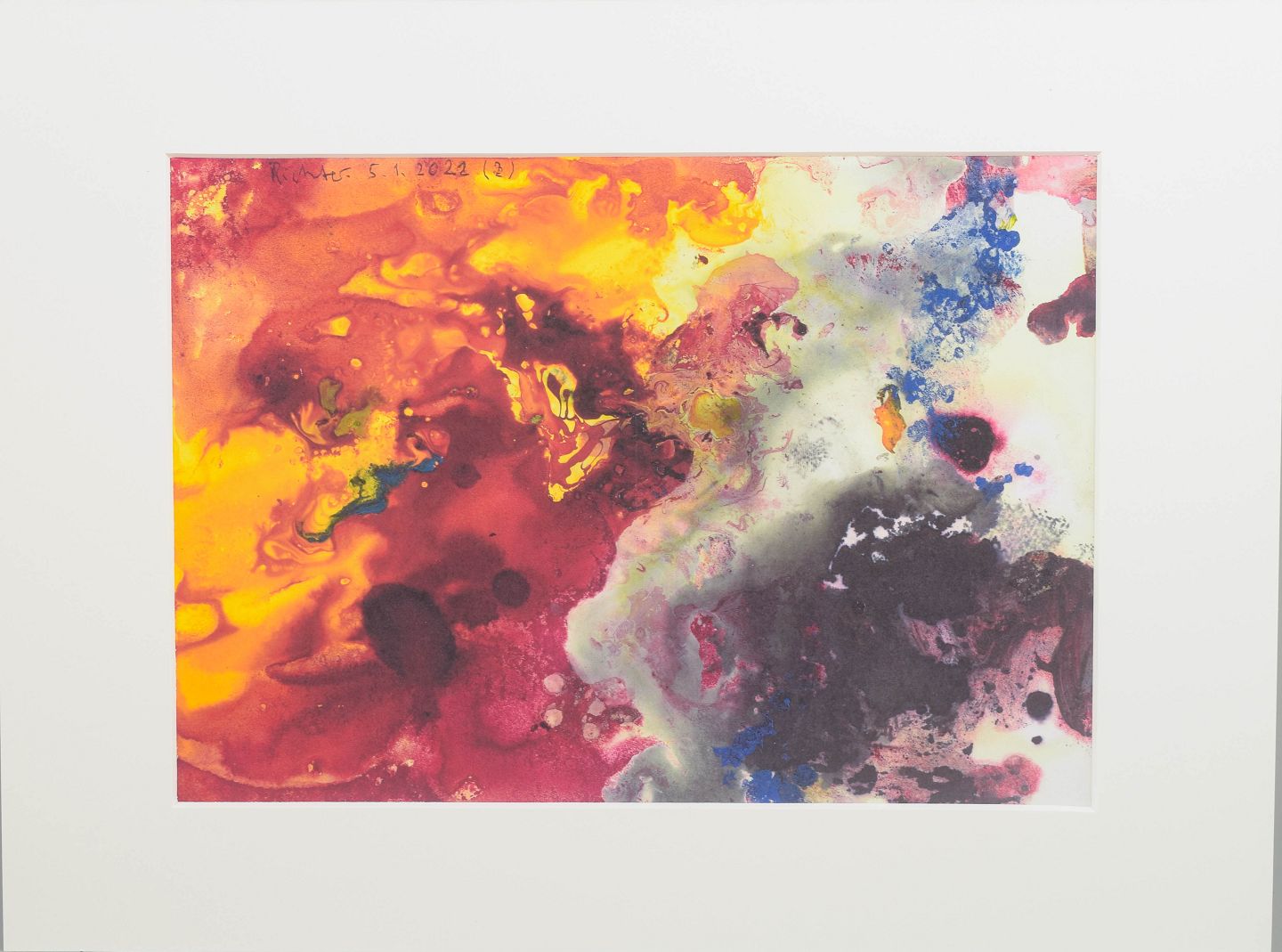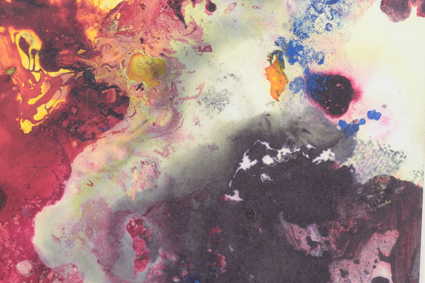 Abstract composition executed as a colour print with dynamic colour fields in intense red, yellow, blue and dark tones. The motif has a fluid and explosive character with organic forms and translucent layers.