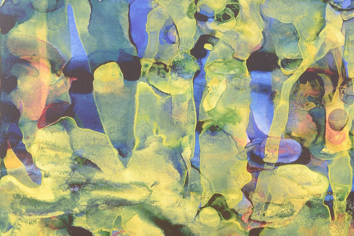 Abstract composition executed as a colour print with fluid organic forms in layered tones of green, blue, yellow and violet. The motif displays a dissolved structure with vertical traces and translucent colour fields. Signed in the print and dated 1991.