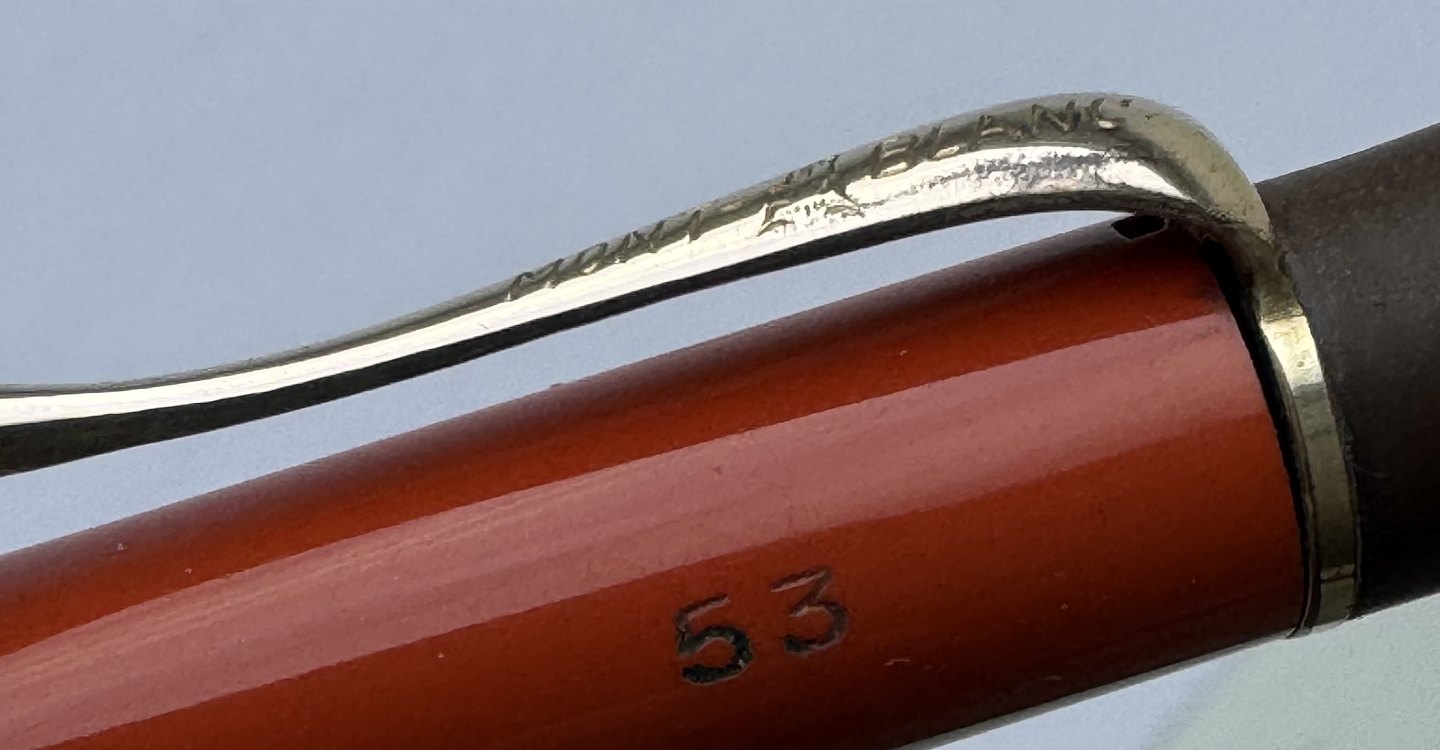 ART DECO PERIOD: Coral red Montblanc no. 53 mecanical pencil with large inset bone-white star on top. Made in the 1920s. Functionality: The pencil tip can be unscrewed, but needs a little help to be screwed back in. Does not screw back naturally when turned counter-clockwise on the top. Imprinted with the factory name MONTBLANC and model number 53. In good condition without damage. Dimensions: 13.5 cm long