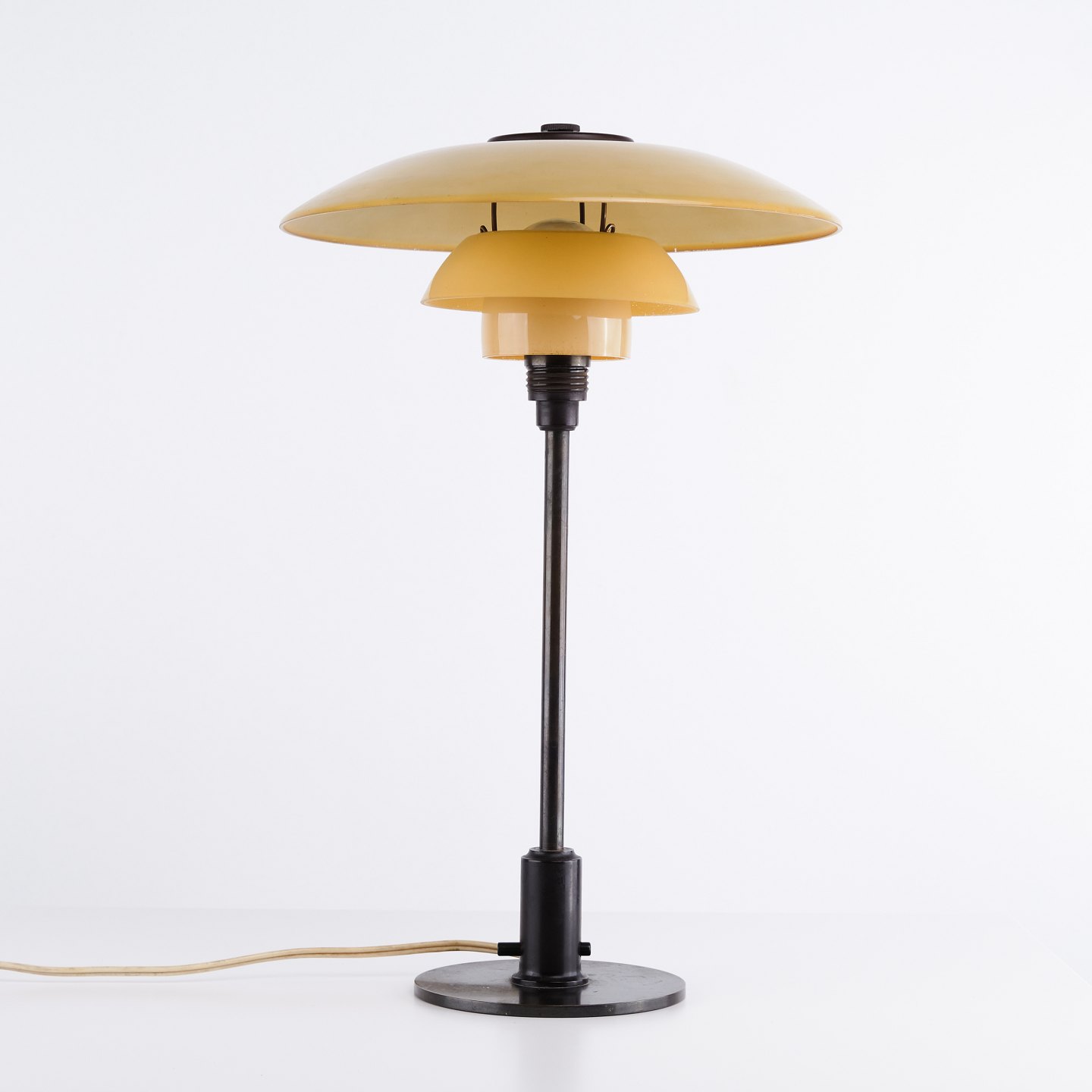 PH 3/2 table lamp designed by Poul Henningsen and produced by Louis Poulsen in the 1930s. The lamp is made with single-layer yellow painted shades, providing a warm and pleasant light. The iconic three-shade system is developed to ensure optimal light distribution and minimize glare.