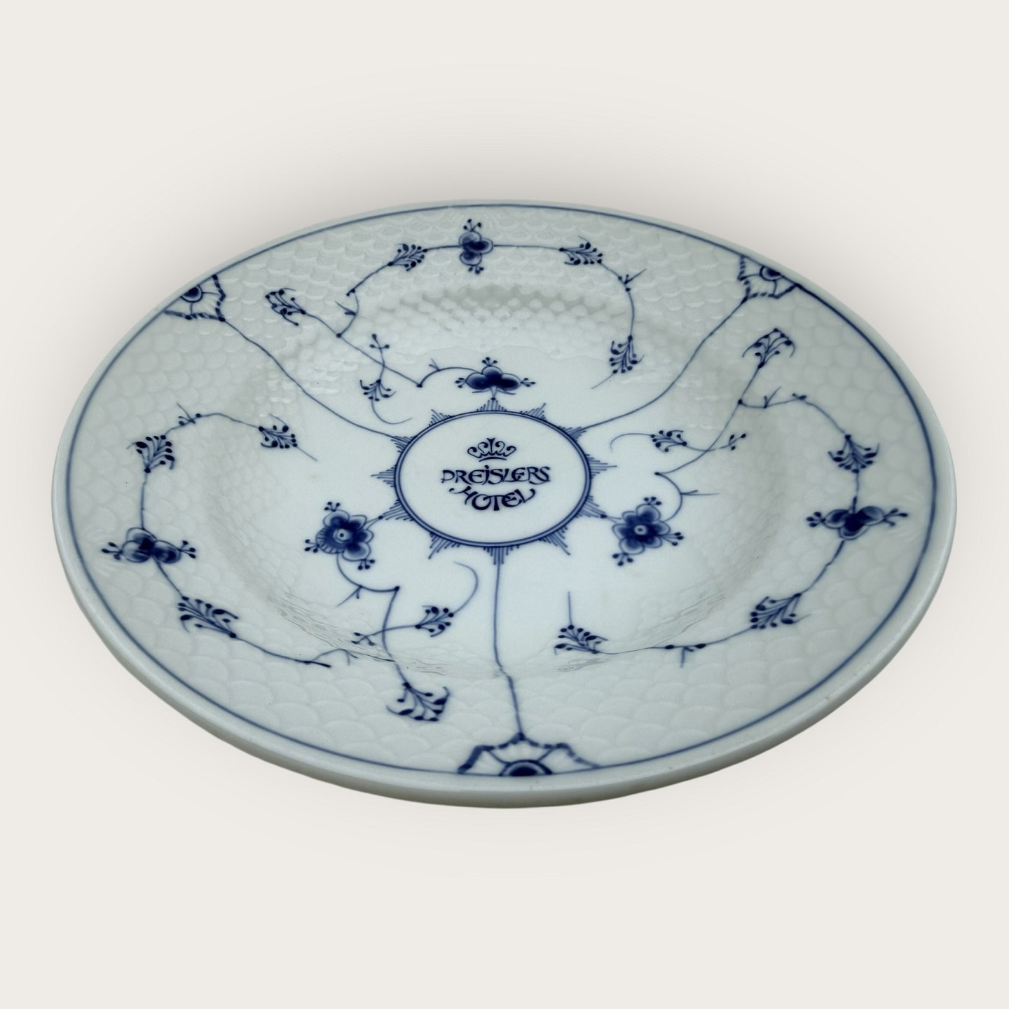 Bing & Grondahl, Blue painted (Blue Fluted), #1008, large deep plate in hotel porcelain (Iron porcelain) with logo from Preislers Hotel, 25cm in diameter, 1st grade * Good condition*