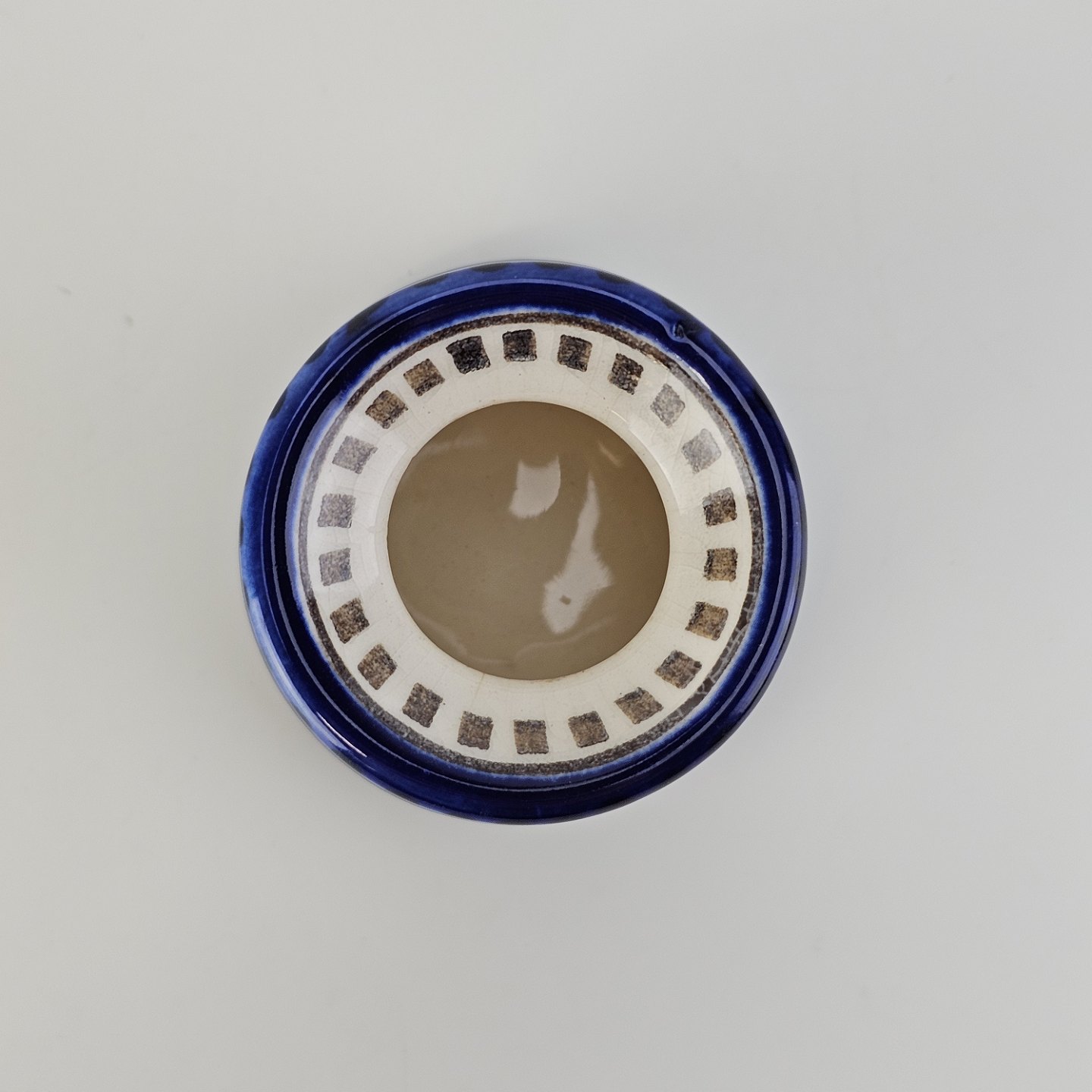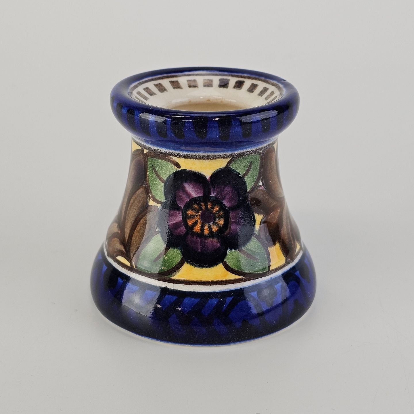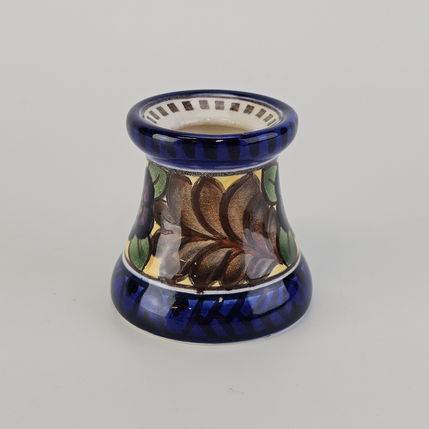 Blækhus i fajance med dekoration af blomster og blå kant