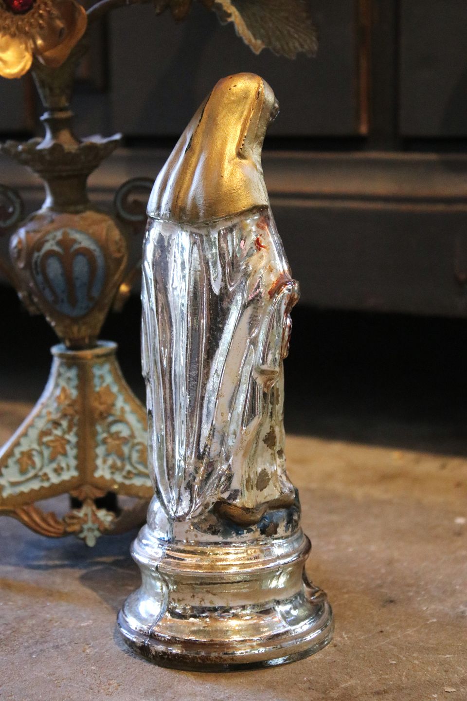 Antique 19th century Madonna figurine in poor man's silver / Mercury glass with fine old painting...