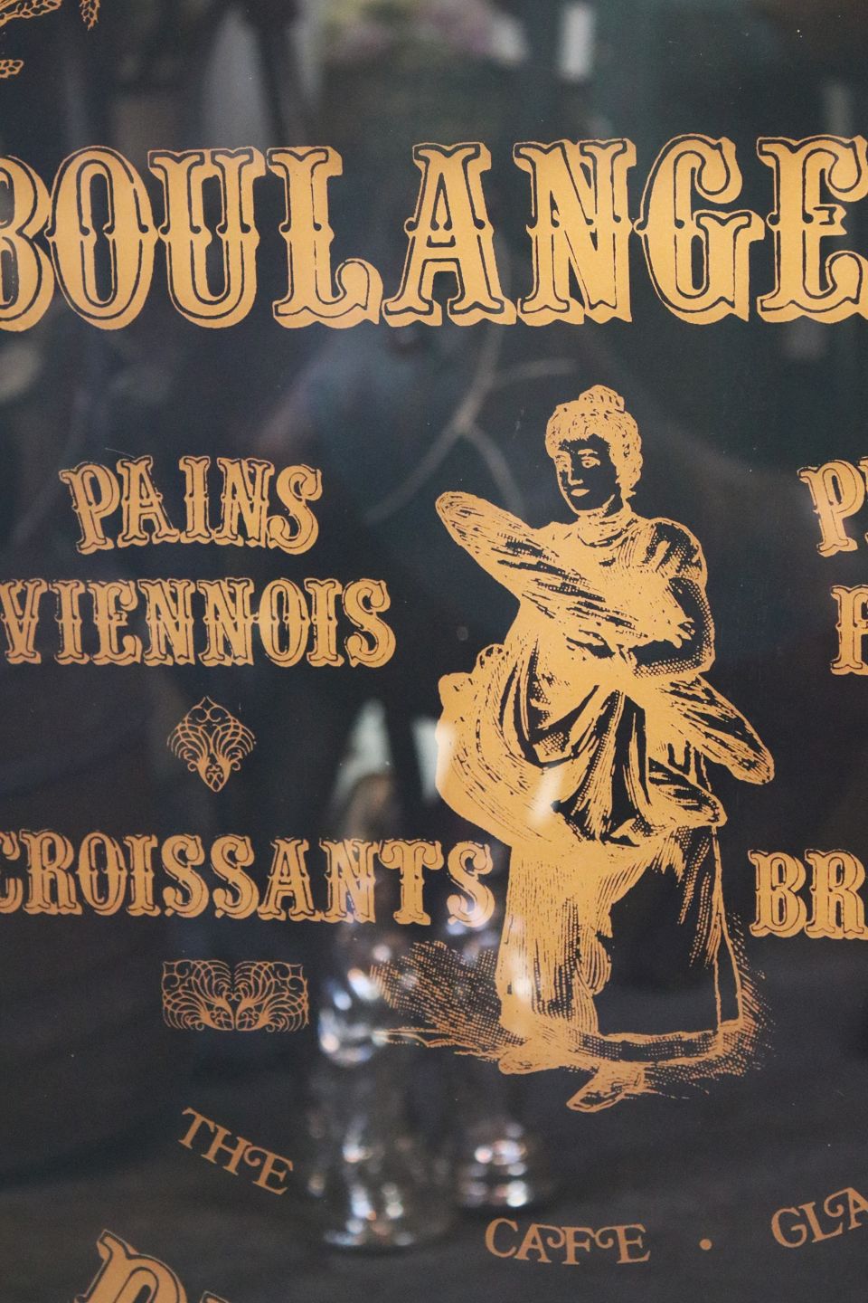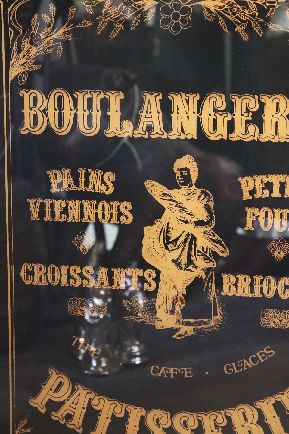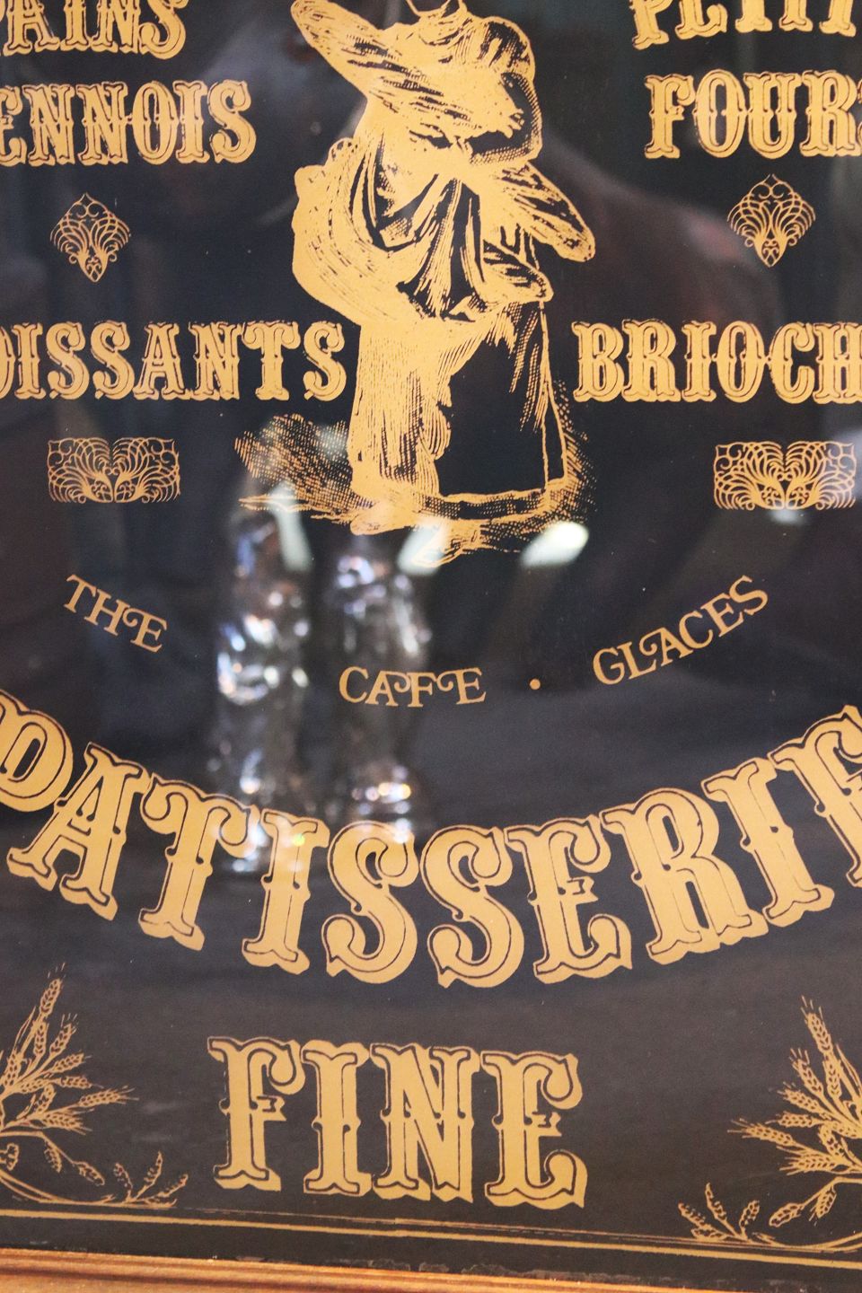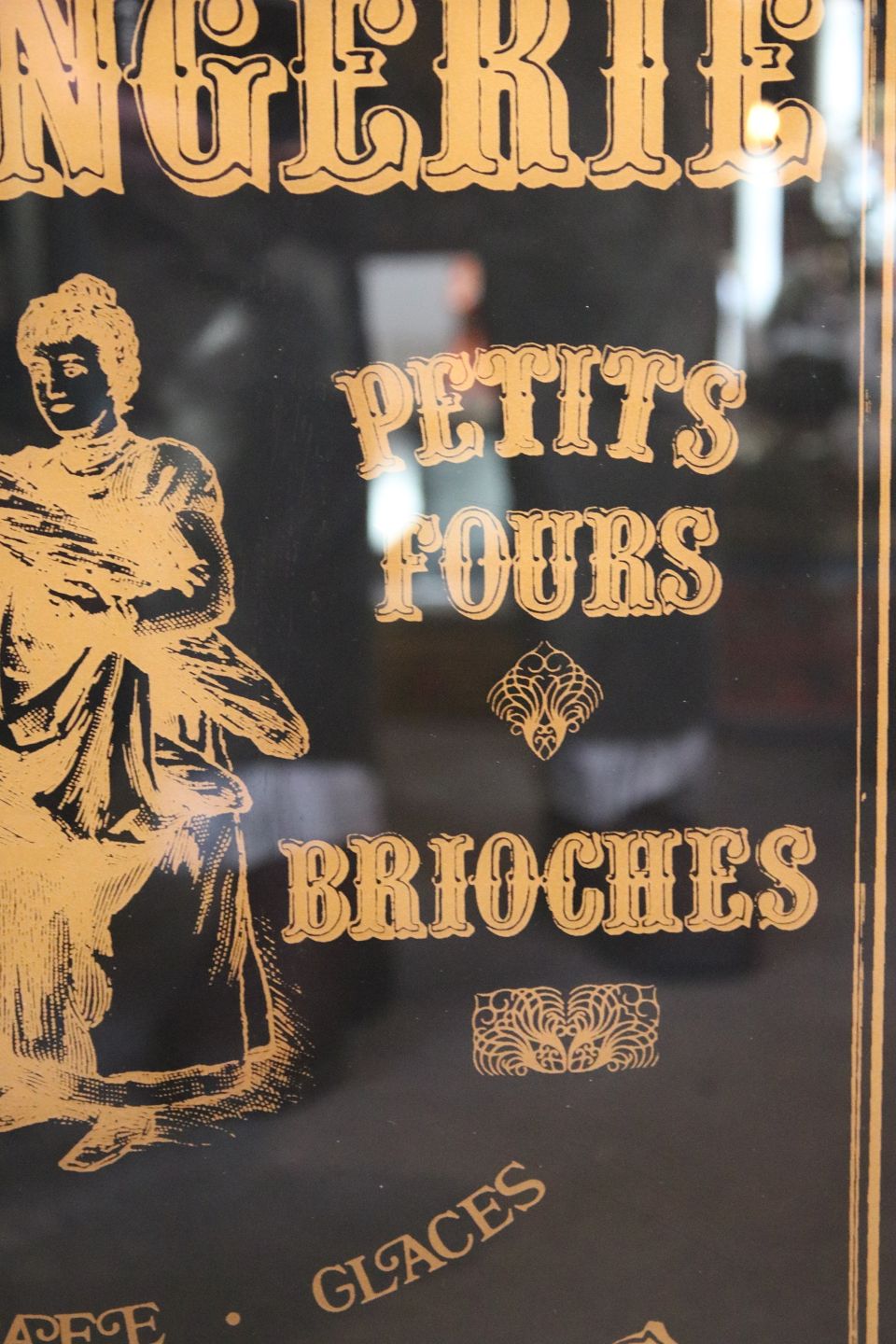 Advertising sign from an old French pastry shop / baker, painted on glass "Boulagerie"...