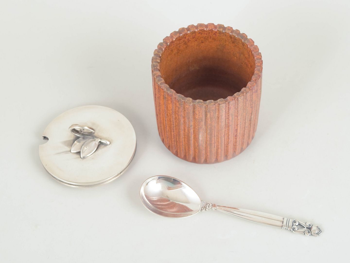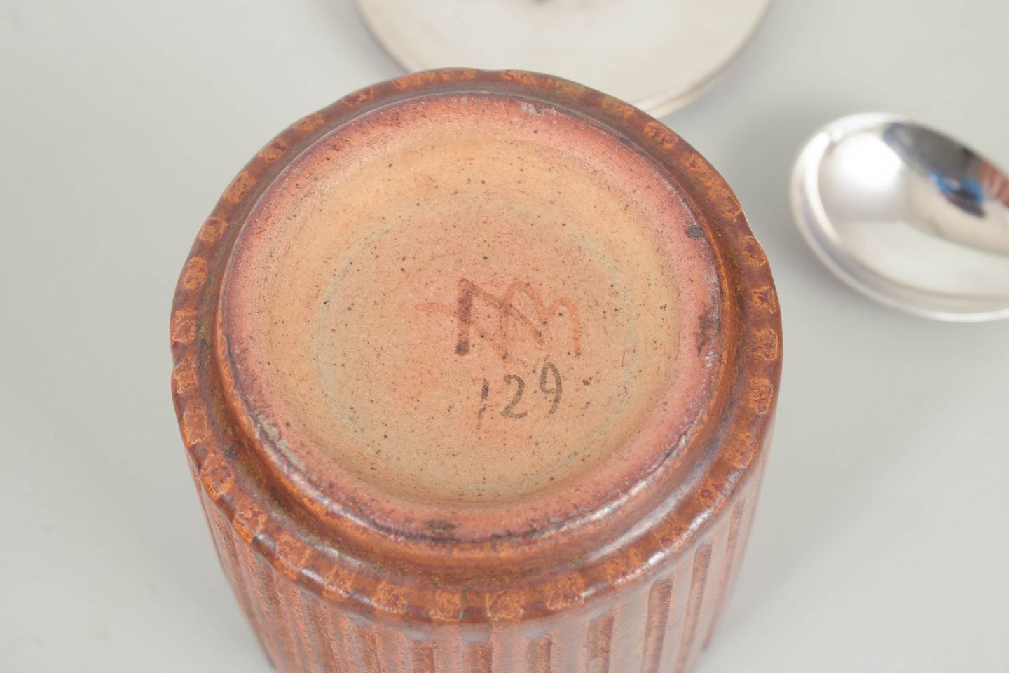Hand-thrown cylindrical stoneware jar, model number 129, with vertically fluted body and a warm reddish-brown glaze with lively surface variation. Fitted with a lid and a Georg Jensen spoon in the Acorn pattern, produced in the 1940s in a refined Art Deco style.