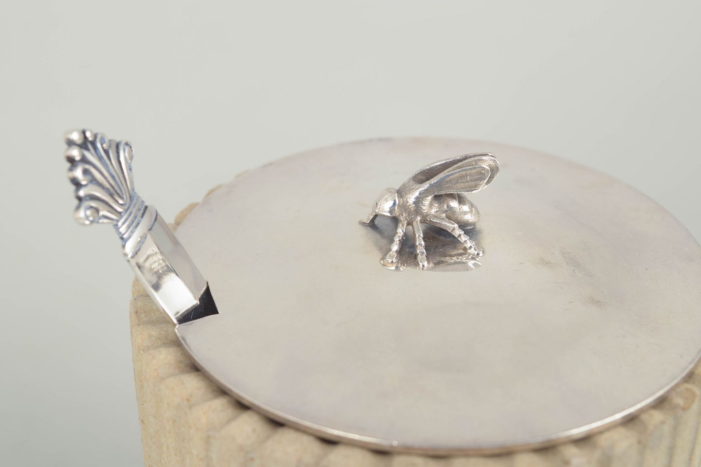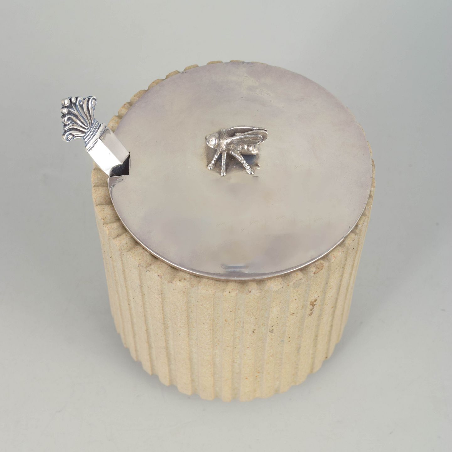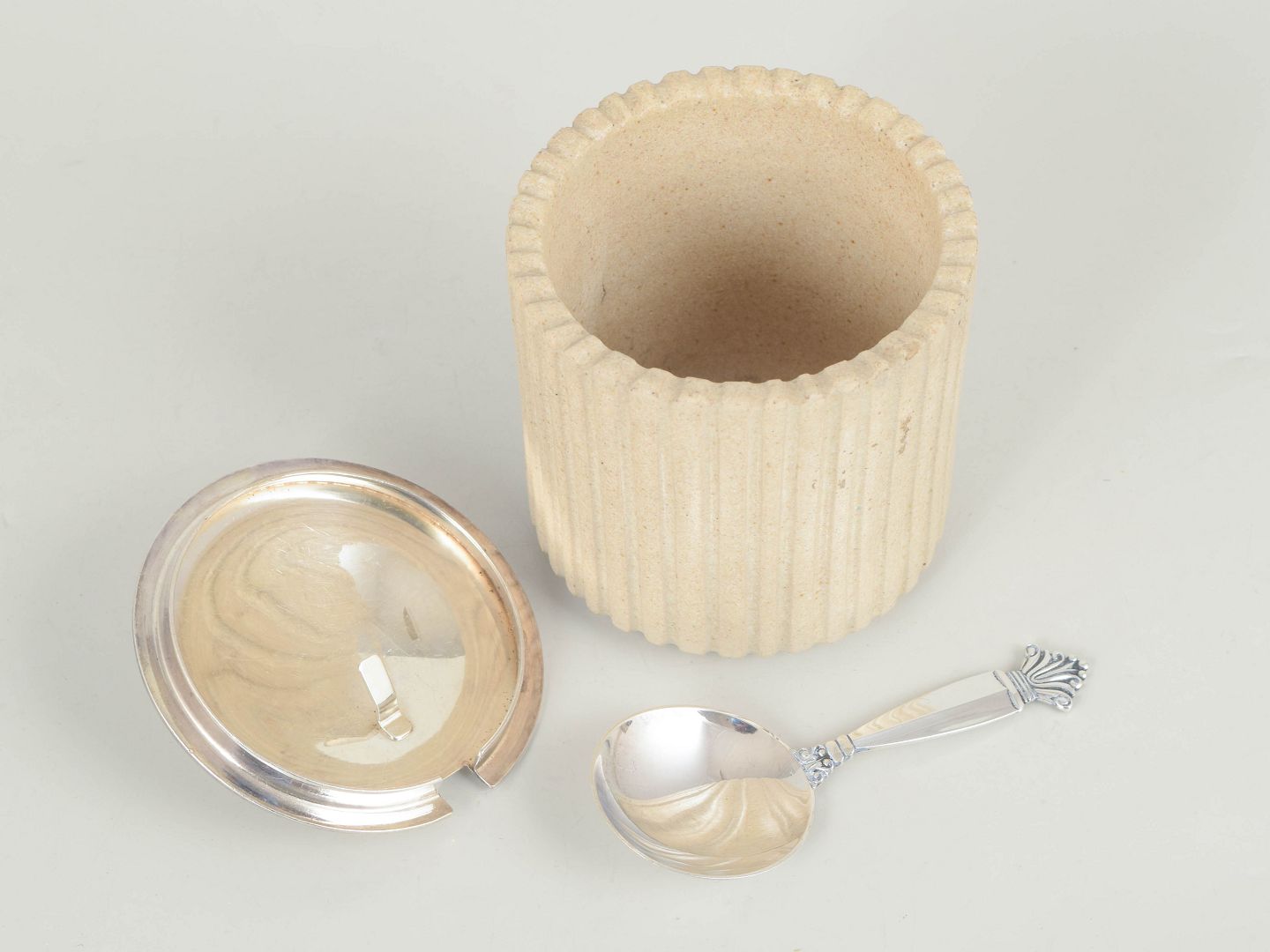 Hand-thrown cylindrical stoneware jar with vertically fluted body and a light matte glaze. Fitted with a sterling silver lid and spoon from Georg Jensen, in the classic Acanthus pattern, produced in the 1940s.