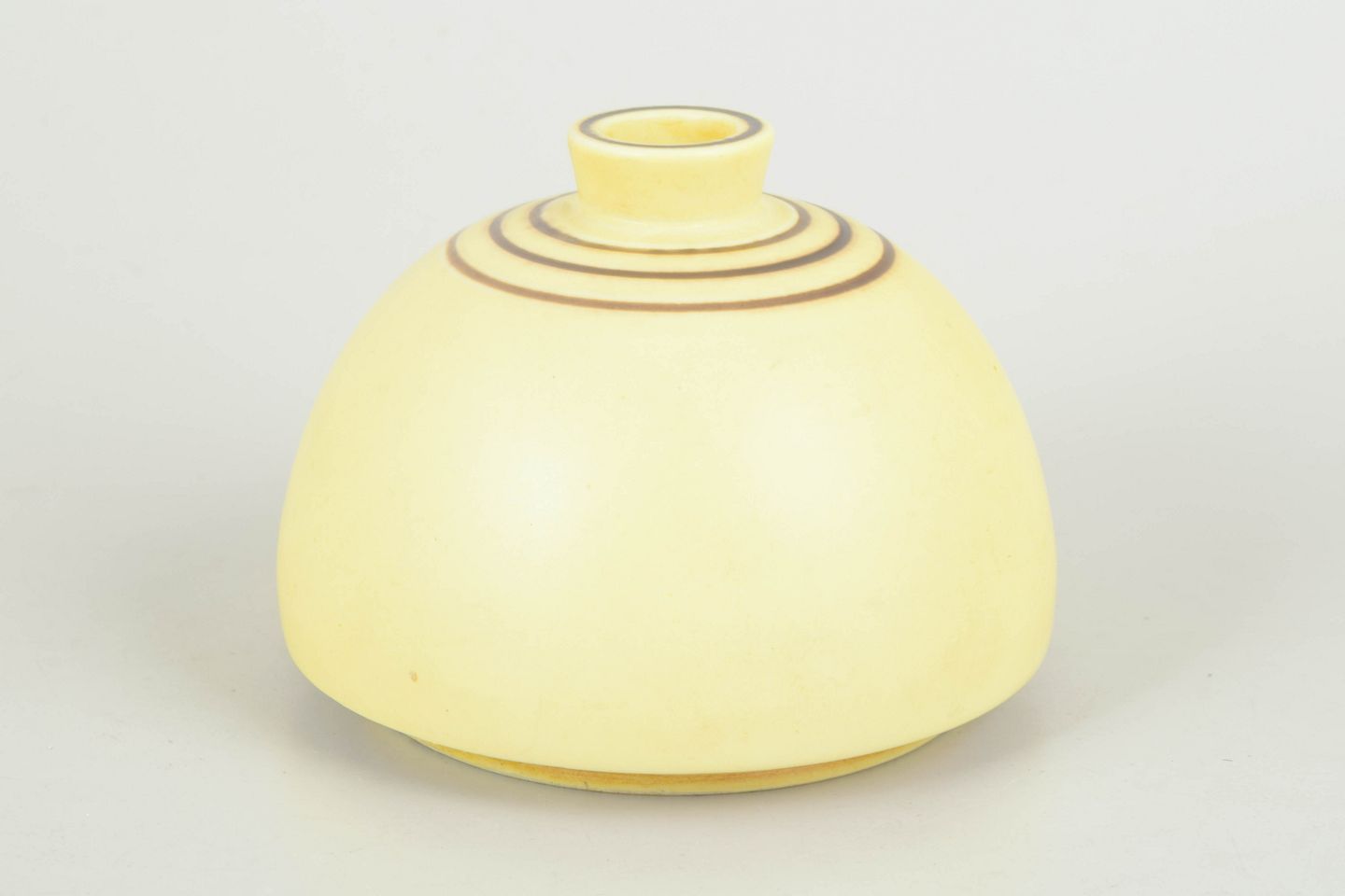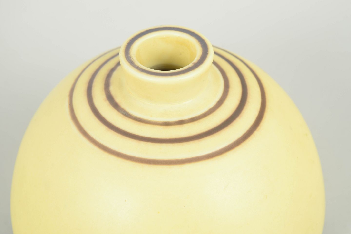 Rare and early stoneware vase with a soft organic form and delicate pale yellow glaze, accented by fine concentric bands at the neck. Signed to the base with Gustavsberg mark and incised monogram.