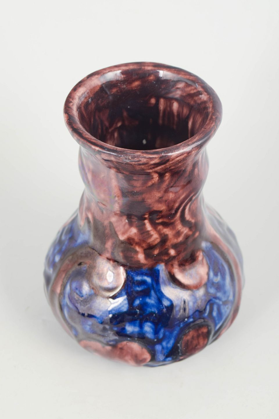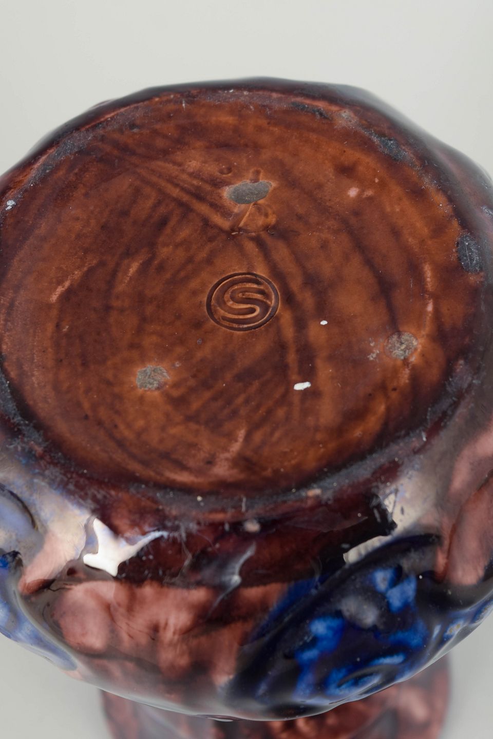 Decorative faience vase with a curved, organic form and slightly constricted neck. Executed in blue and brown glaze on a light ground. Signed to the base.