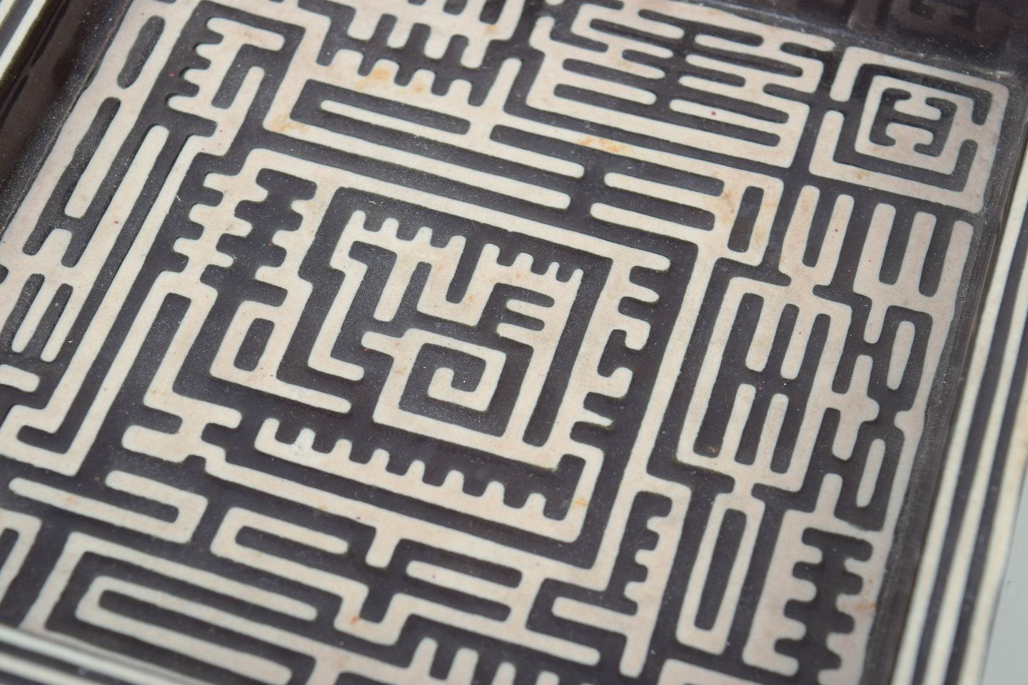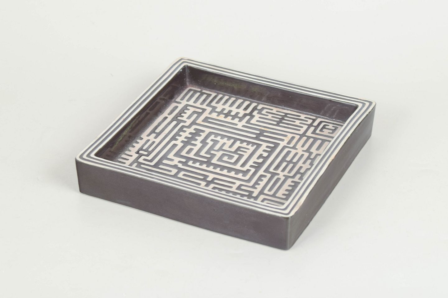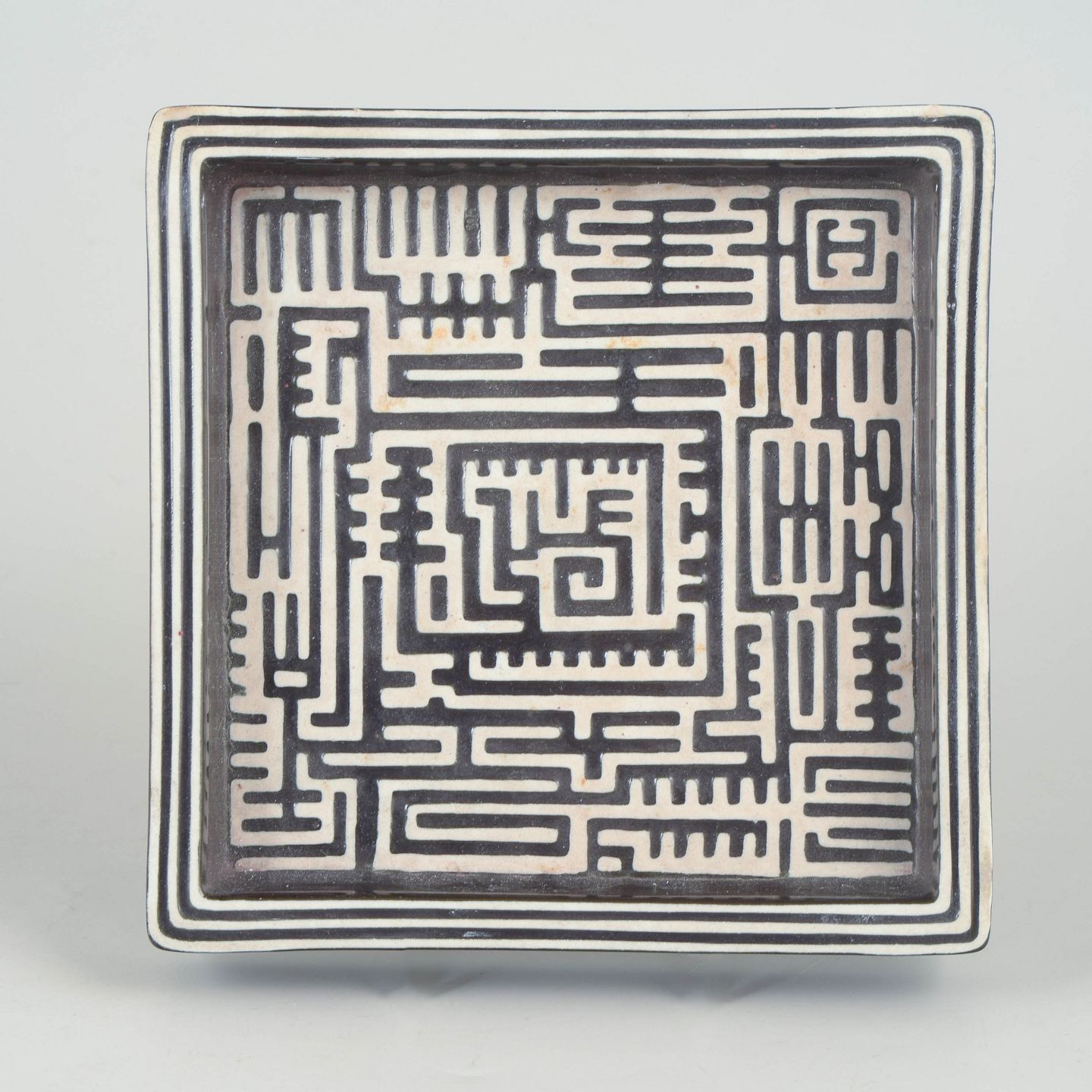 Square stoneware dish decorated with the characteristic Domino pattern in black on a light ground, featuring a graphic labyrinth-like ornamentation. Model Domino.