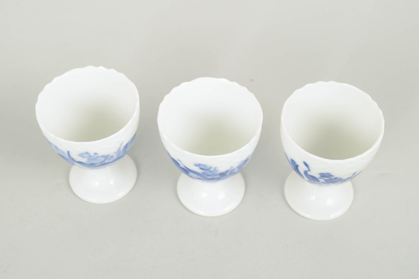 Set of three porcelain egg cups decorated with hand-painted blue floral motif in relief. Model number 10/1568, 1st factory quality, early 20th century.