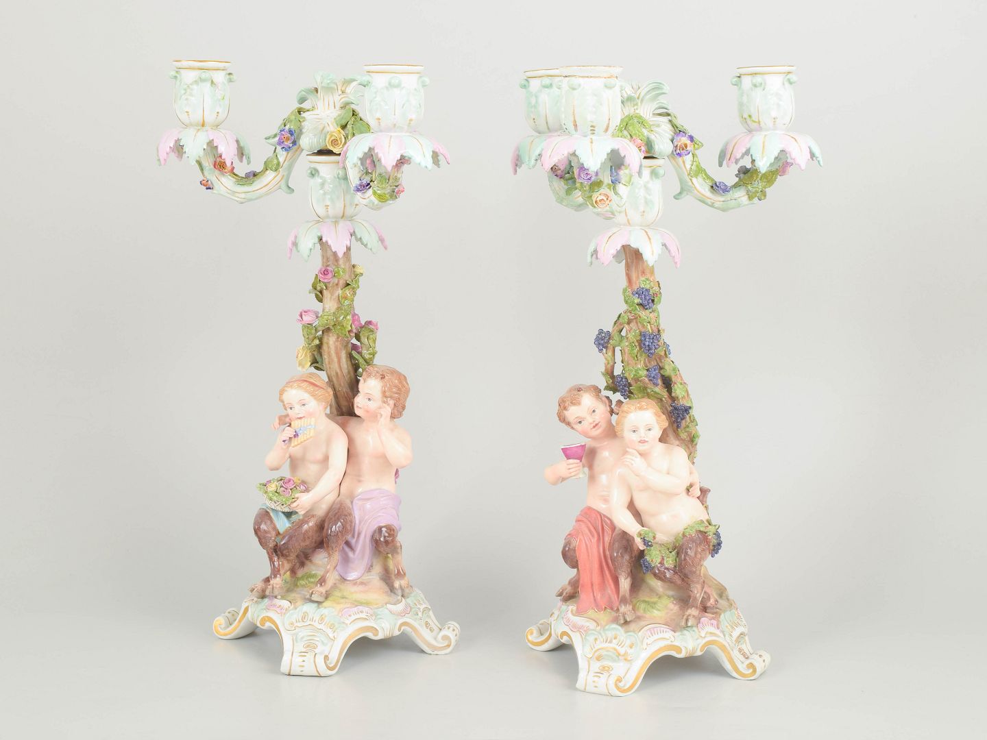 Impressive and richly modelled porcelain candlesticks with three arms, designed with a naturalistic tree trunk, floral decoration and figural groups featuring putti and satyrs in polychrome glaze. Marked underneath with the Meissen crossed swords.
