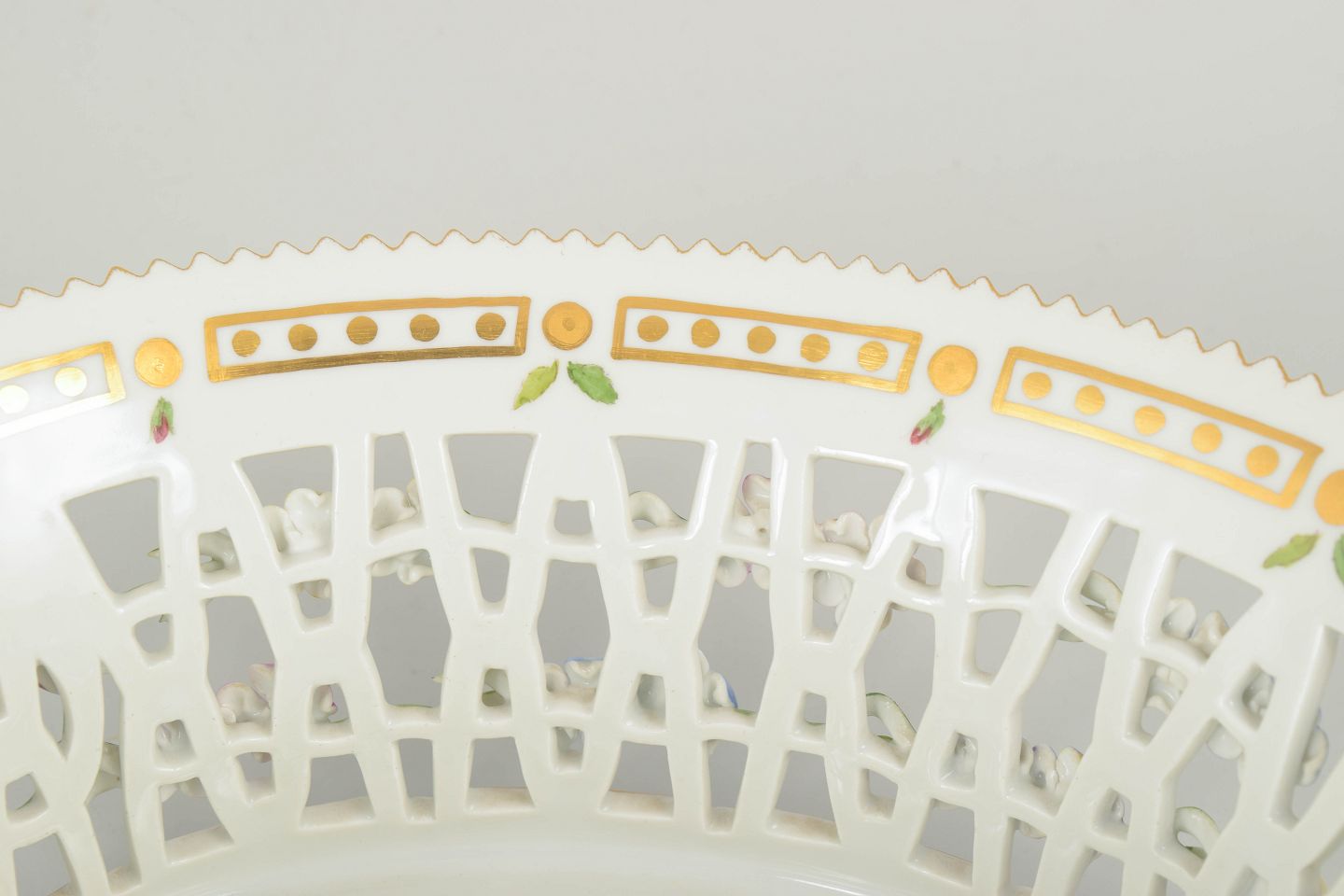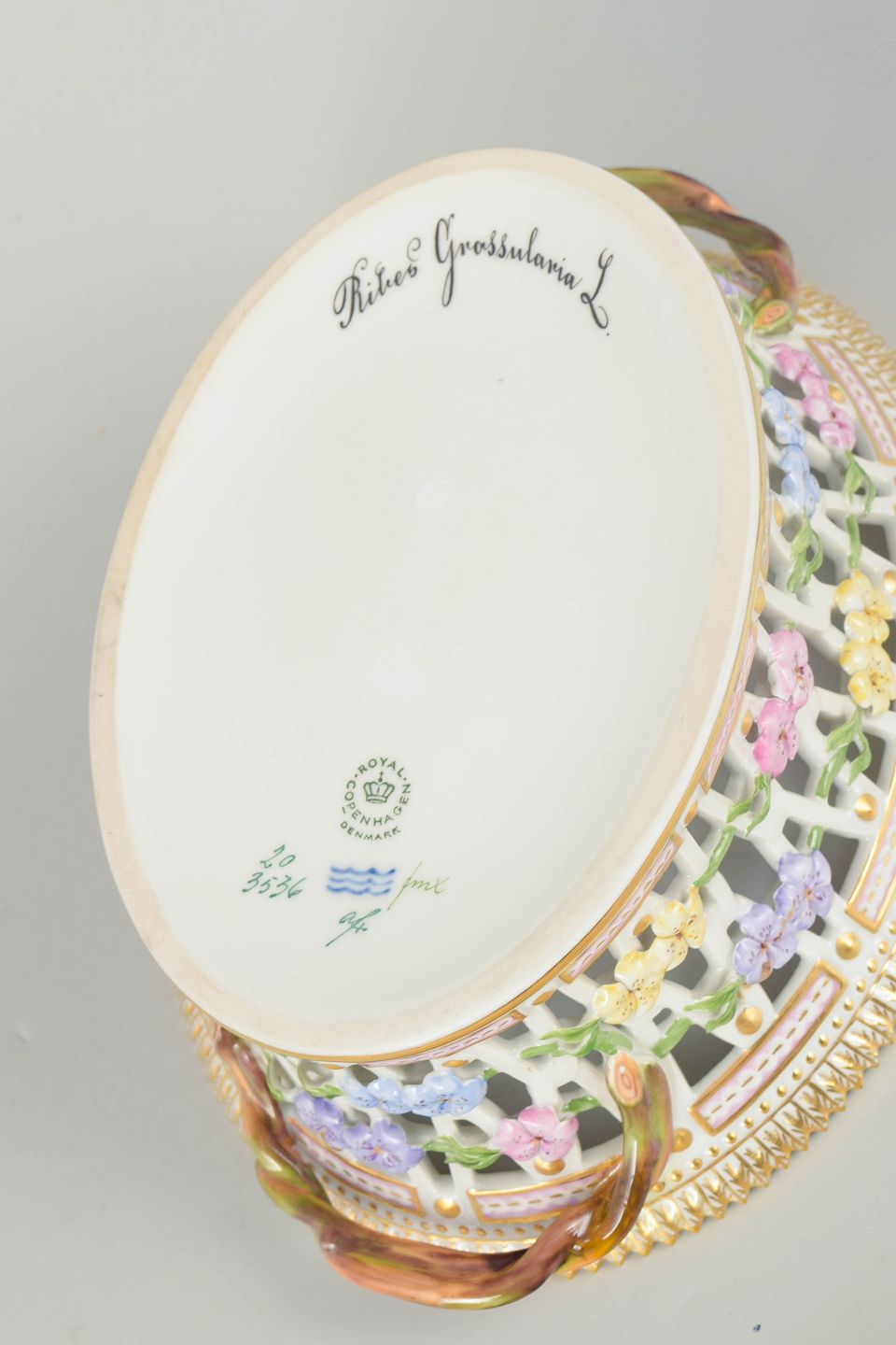Open reticulated basket with pierced body and hand-painted botanical decoration from the Flora Danica series. Executed in porcelain with fine detailing and gilding. Model 20/3536, 1st factory quality, dated 1964.