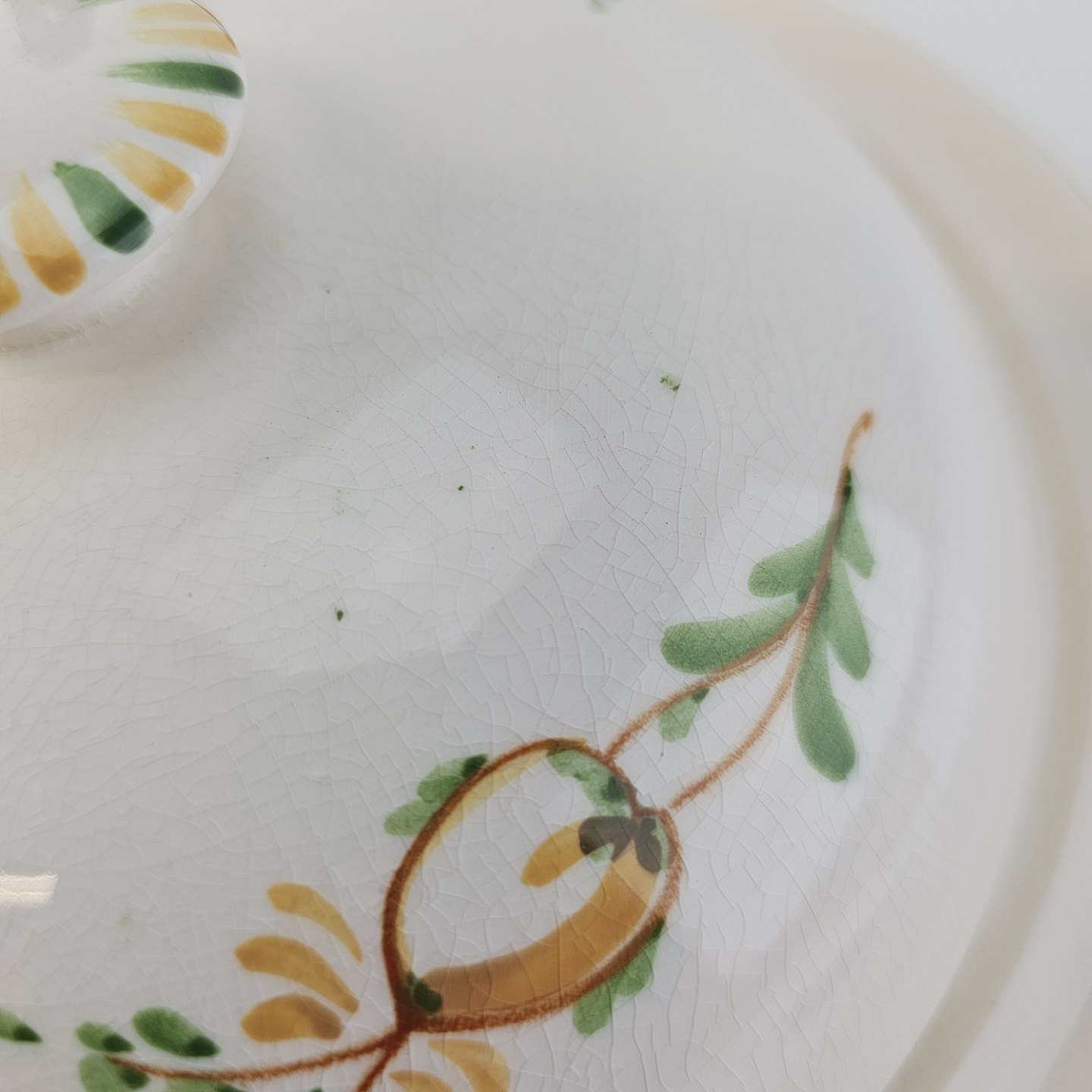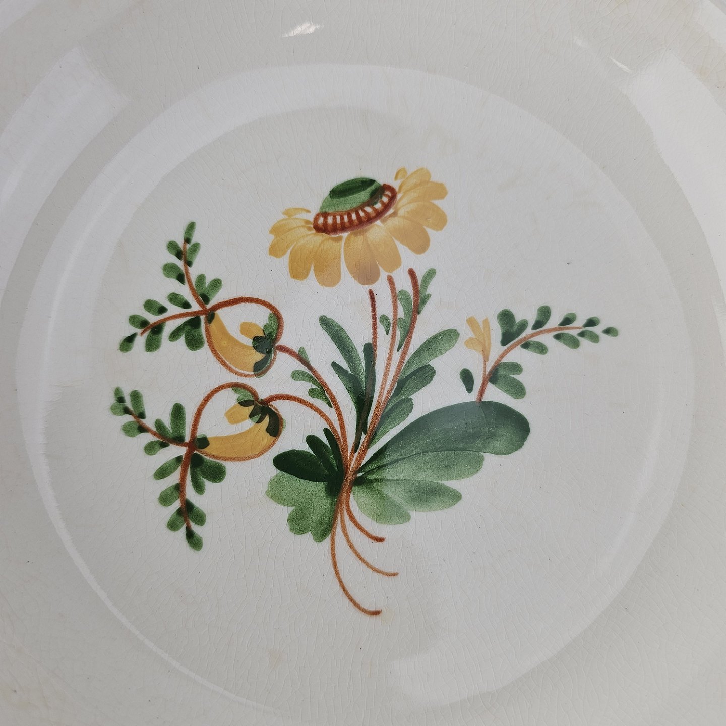 Hvidt fajancestel i stelform Feston/Alma med motiv af gule blomster og grønne blade.