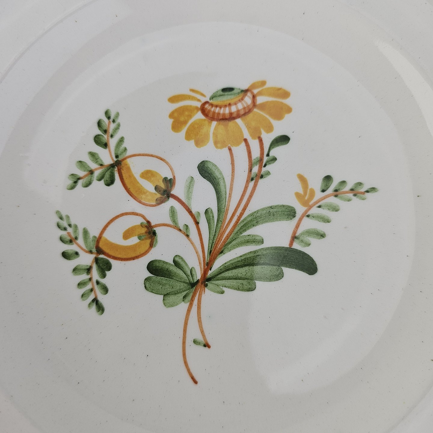 Hvidt fajancestel i stelform Feston/Alma med motiv af gule blomster og grønne blade.