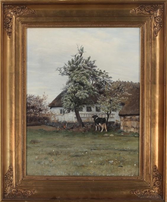 Mols, Niels Pedersen (1859 - 1921) Denmark: Lot from a farm with chickens and a cow.