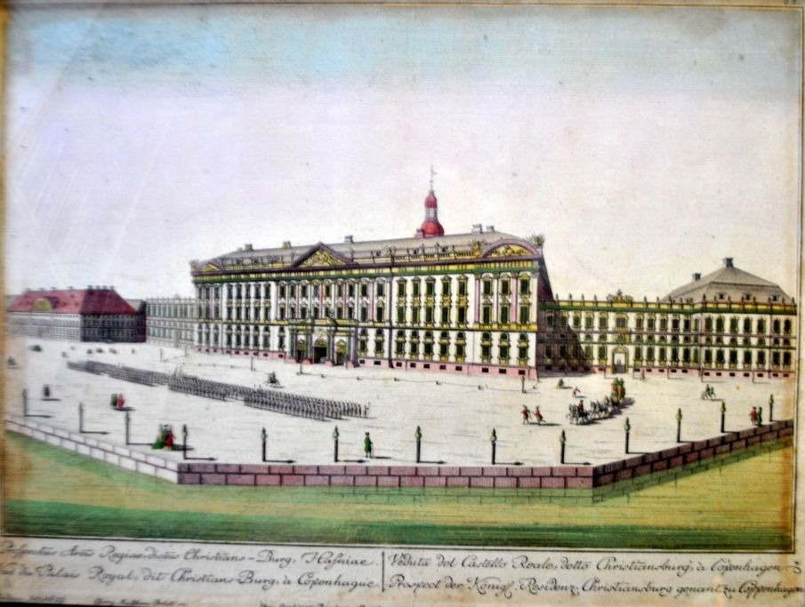Probst, Georg Balthasar (1673 - 1747) Germany: Christianborg Castle, Copenhagen. Hand-colored copper engraving. Signed. 32 x 42 cm.