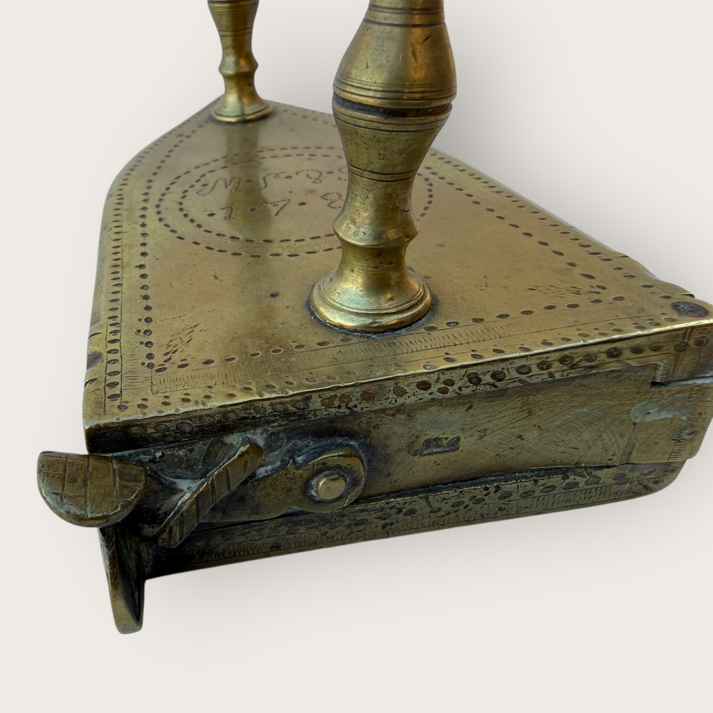 Brass iron, marked with owner's initials and 1784, Dimensions approx.: HxLxW 11x14x8cm *Good used condition*
