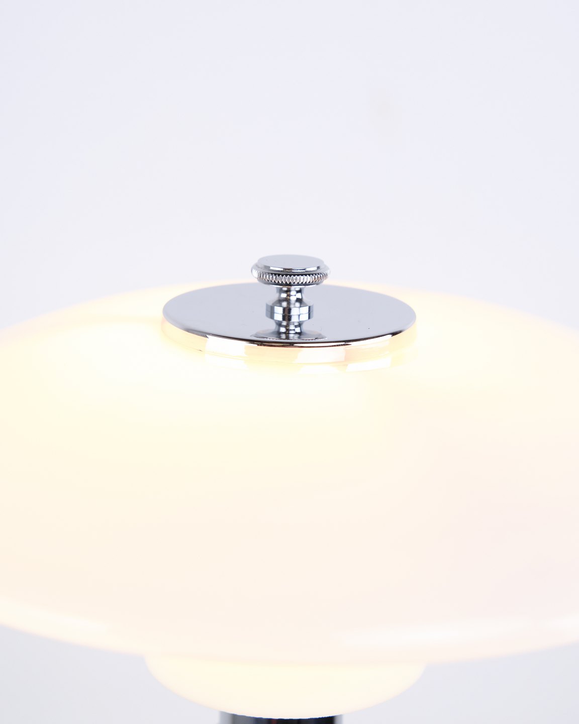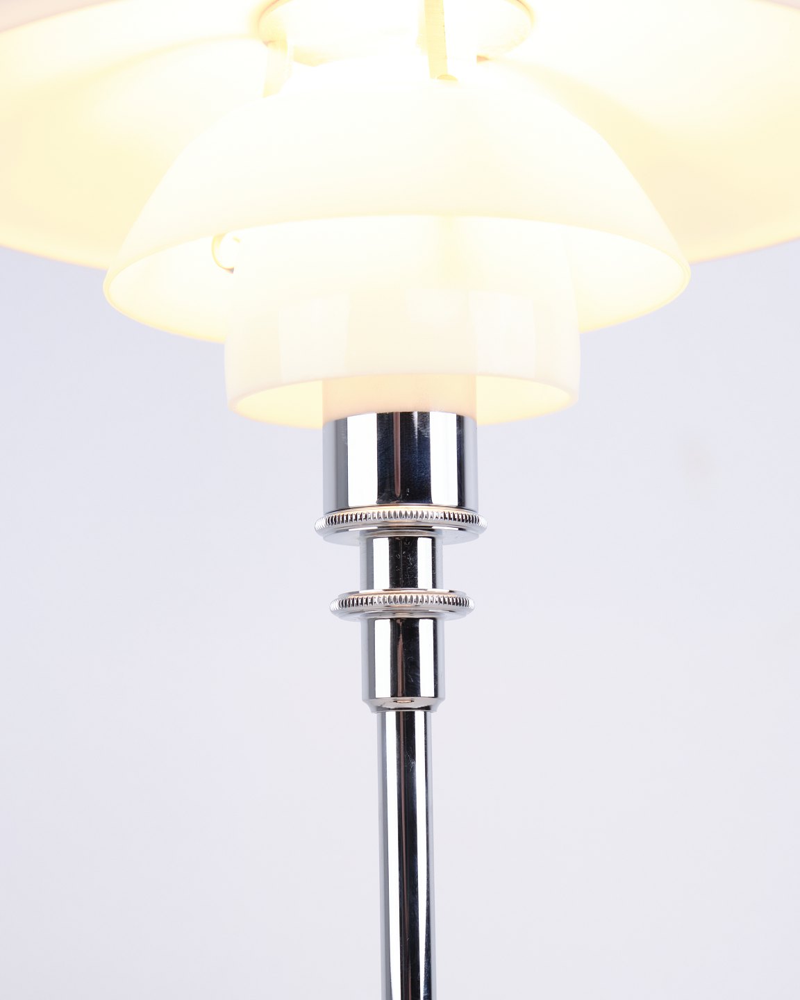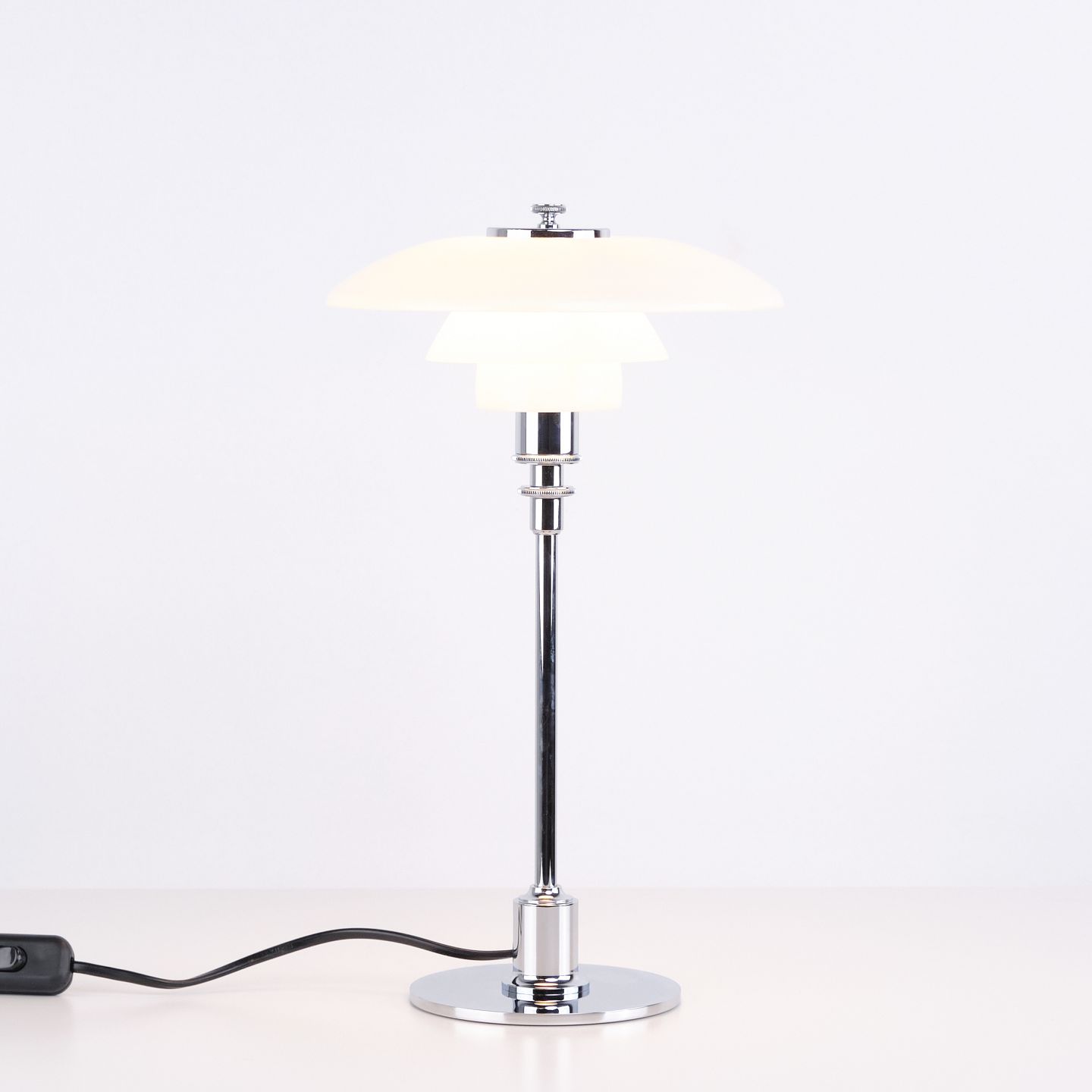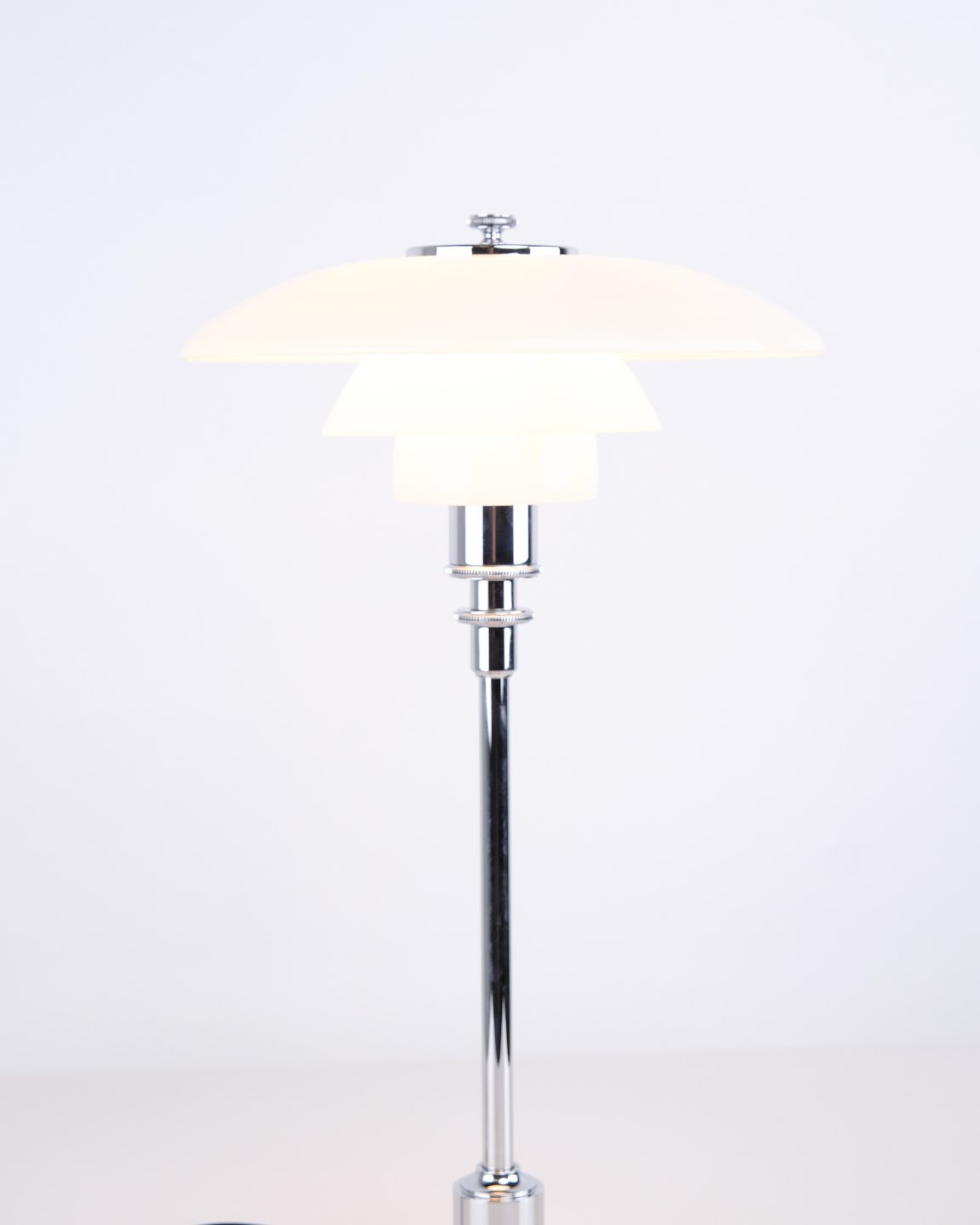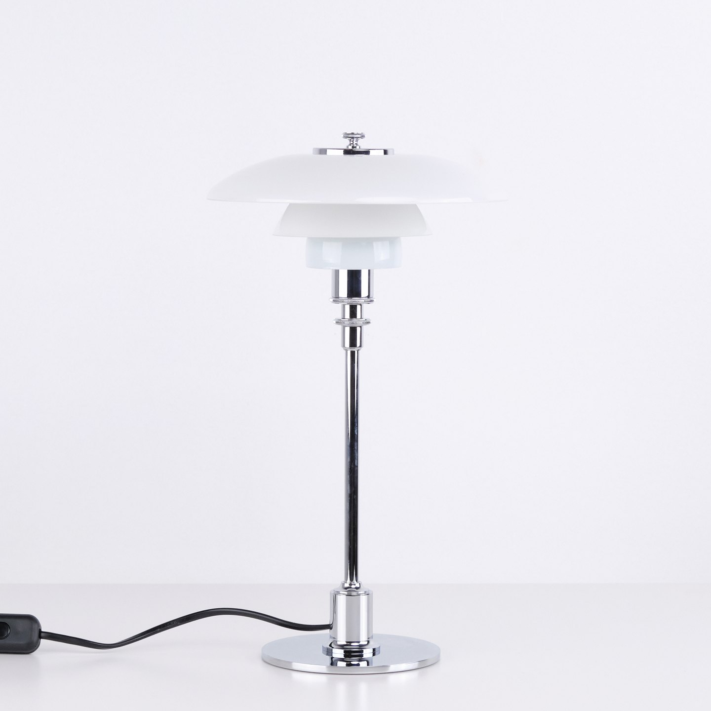 Classic PH 2/1 table lamp designed by Poul Henningsen and manufactured by Louis Poulsen. The lamp is made in chrome with white opal glass shades, giving a light and elegant appearance. The model features a top shade of approx. 20 cm combined with middle and lower shades from PH 1/1, creating a distinct proportion in the design.