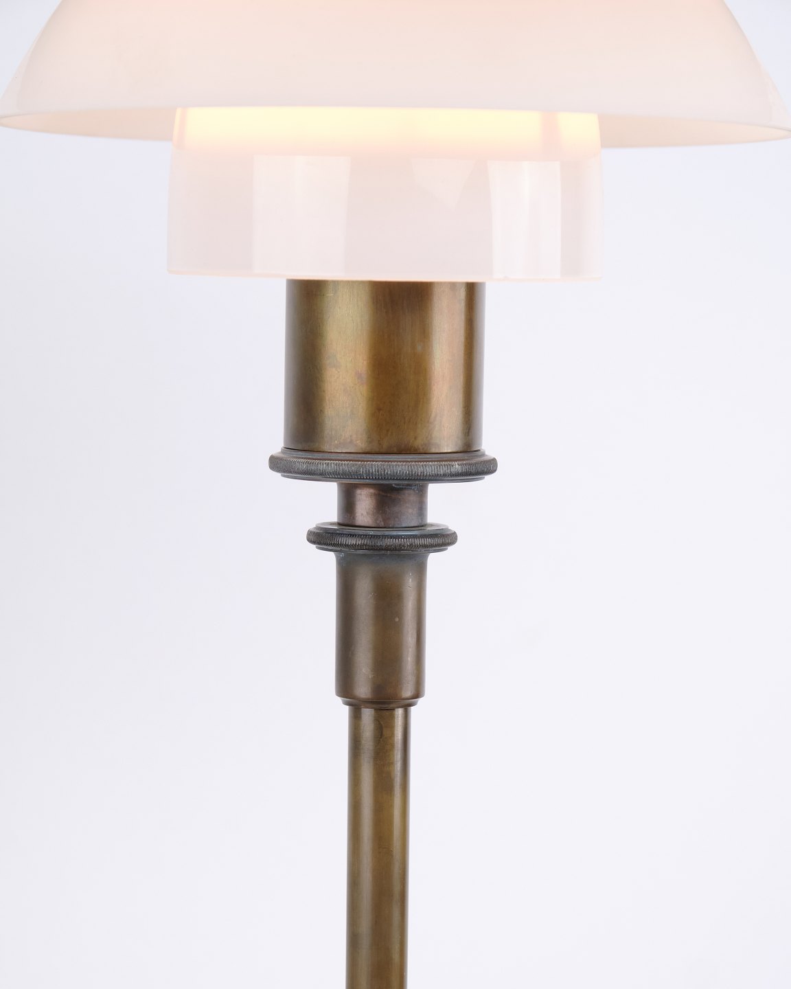 — Material: Burnished brass and white opal glass