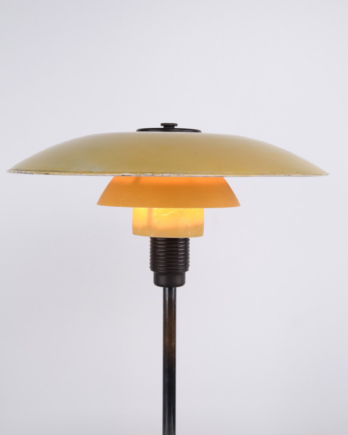 PH 3½/2½ table lamp designed by Poul Henningsen and manufactured by Louis Poulsen in the 1930s. The lamp features a yellow metal top shade with middle and lower shades in yellow-painted opal glass, creating a warm and distinctive light. The combination of materials and colours highlights the lamp’s functional and decorative character.