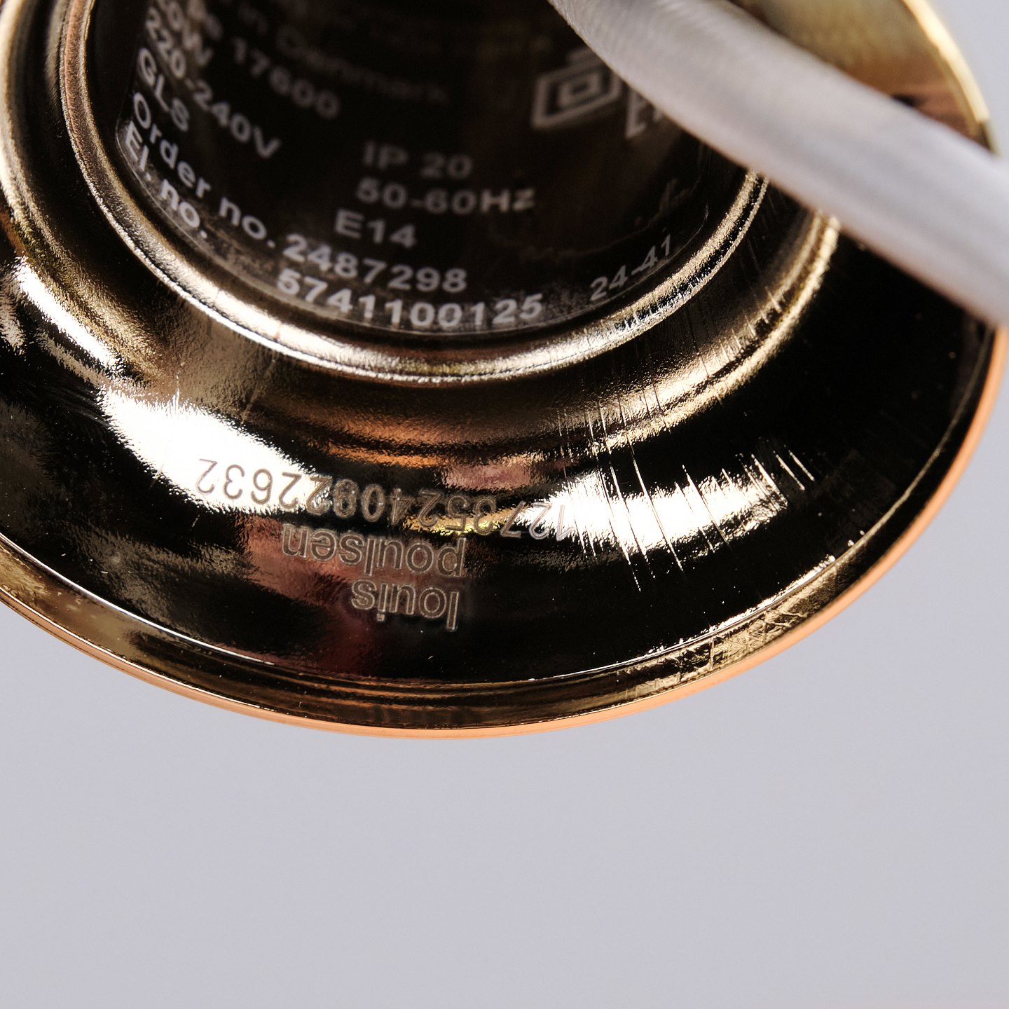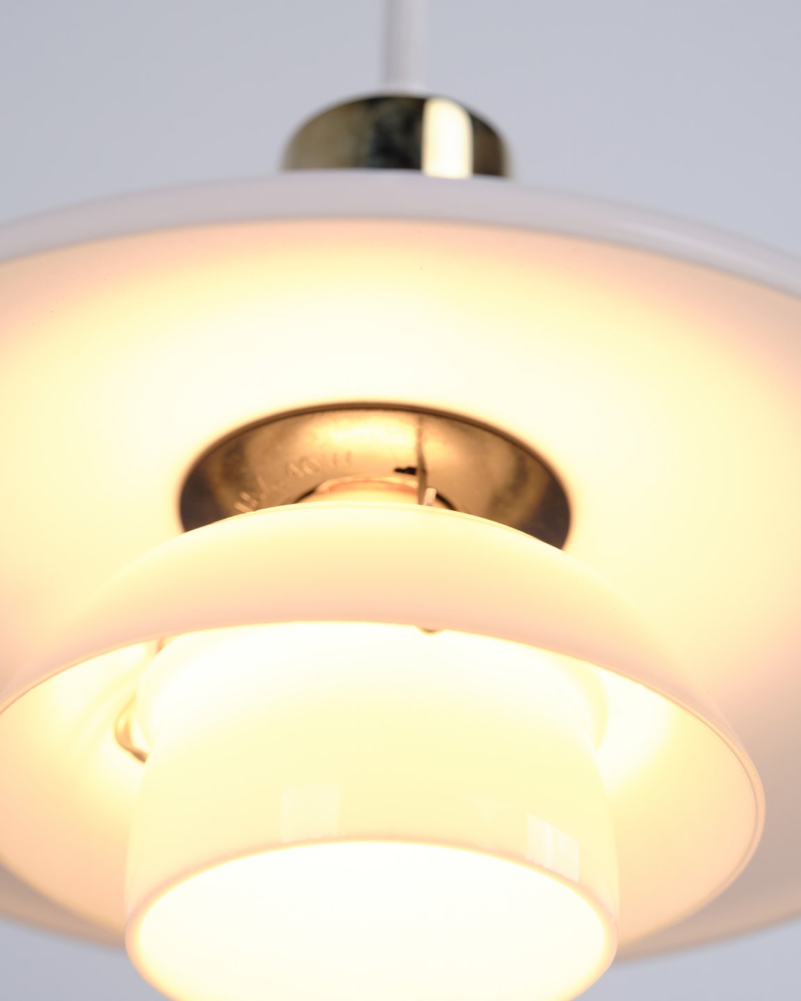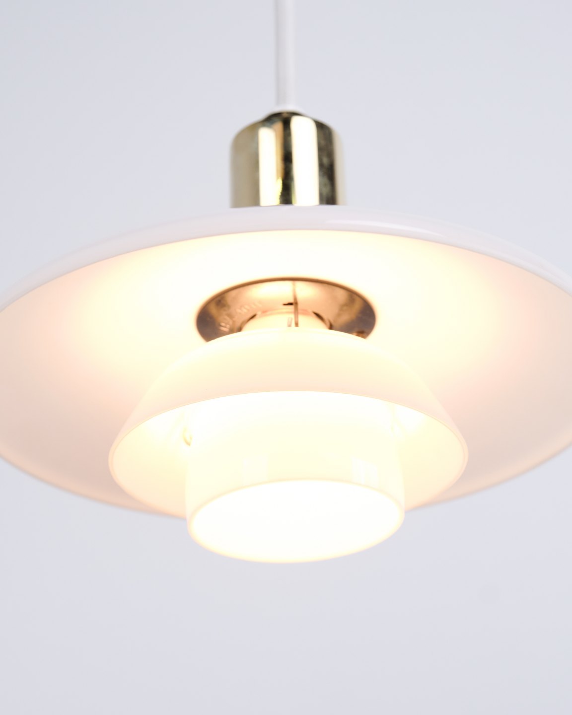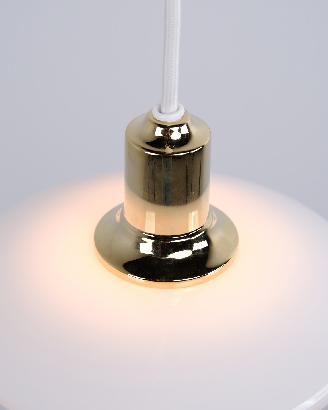 PH 2/1 pendant in brass with opal glass from Louis Poulsen. Designed by Poul Henningsen with classic Danish lighting design and glare-free illumination.