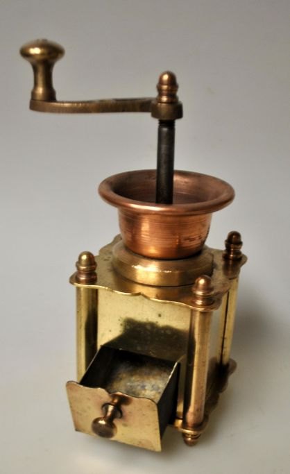 Small antique coffee grinder in brass/copper, 19th century. Denmark.