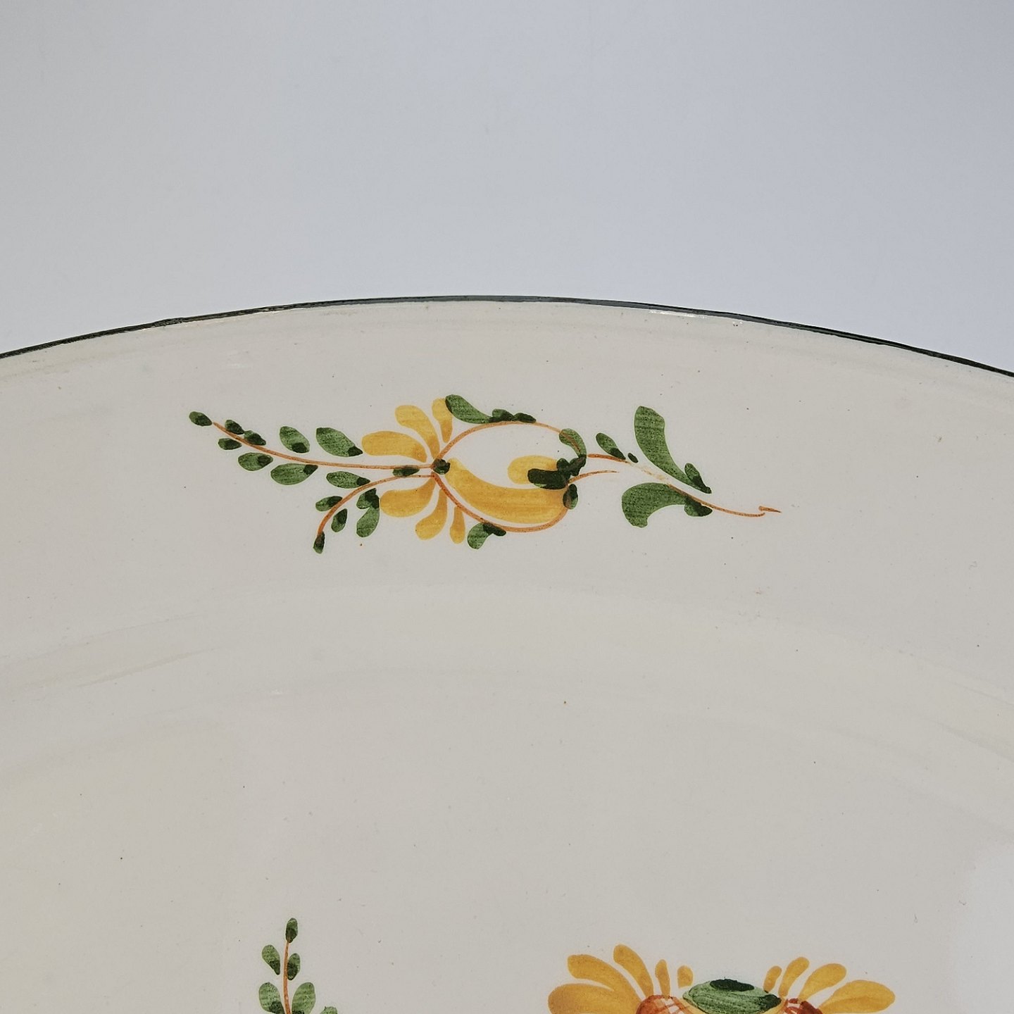 Hvidt fajancestel i stelform Feston/Alma med motiv af gule blomster og grønne blade.