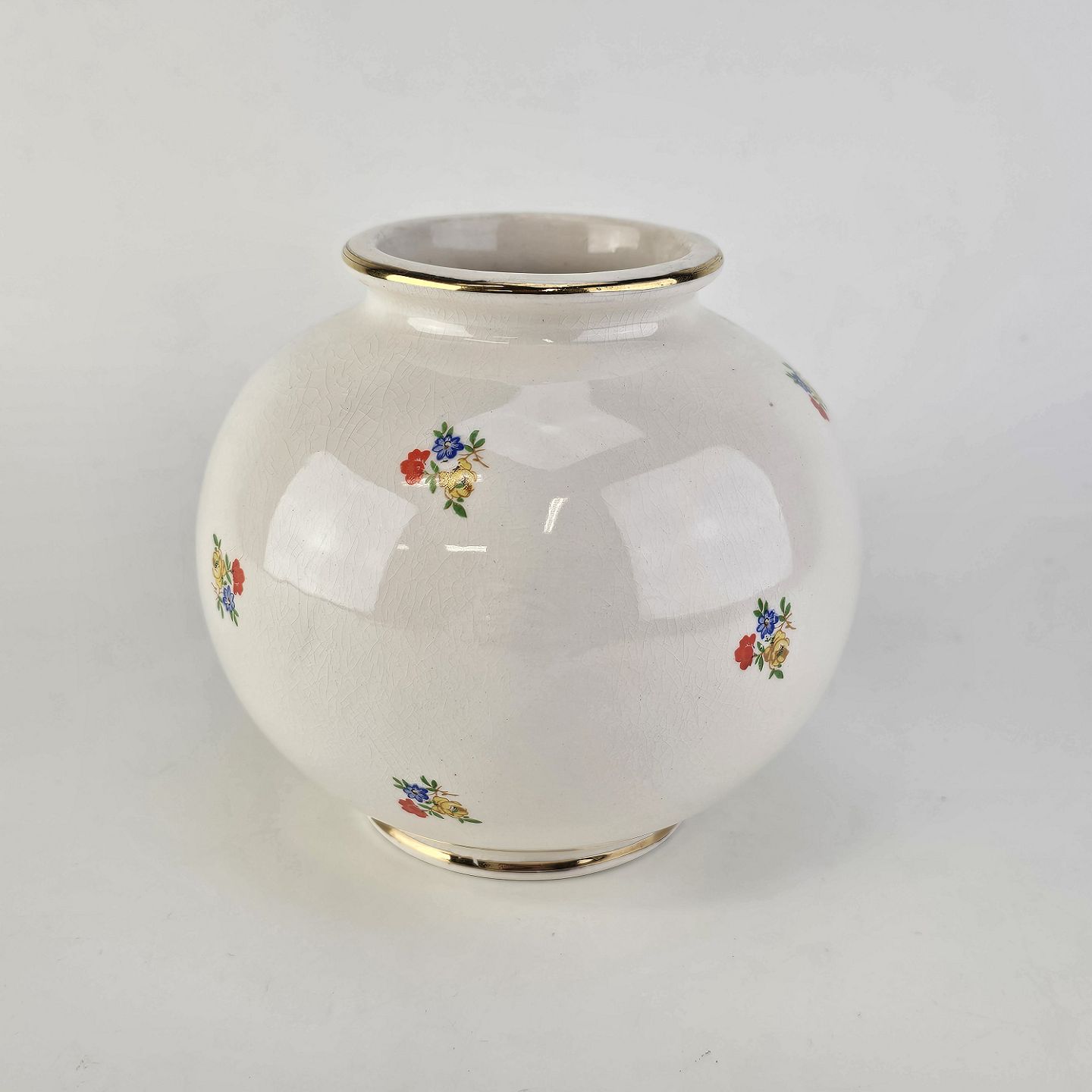 Rund vase i hvid fajance med blomsterdekoration og guldkant