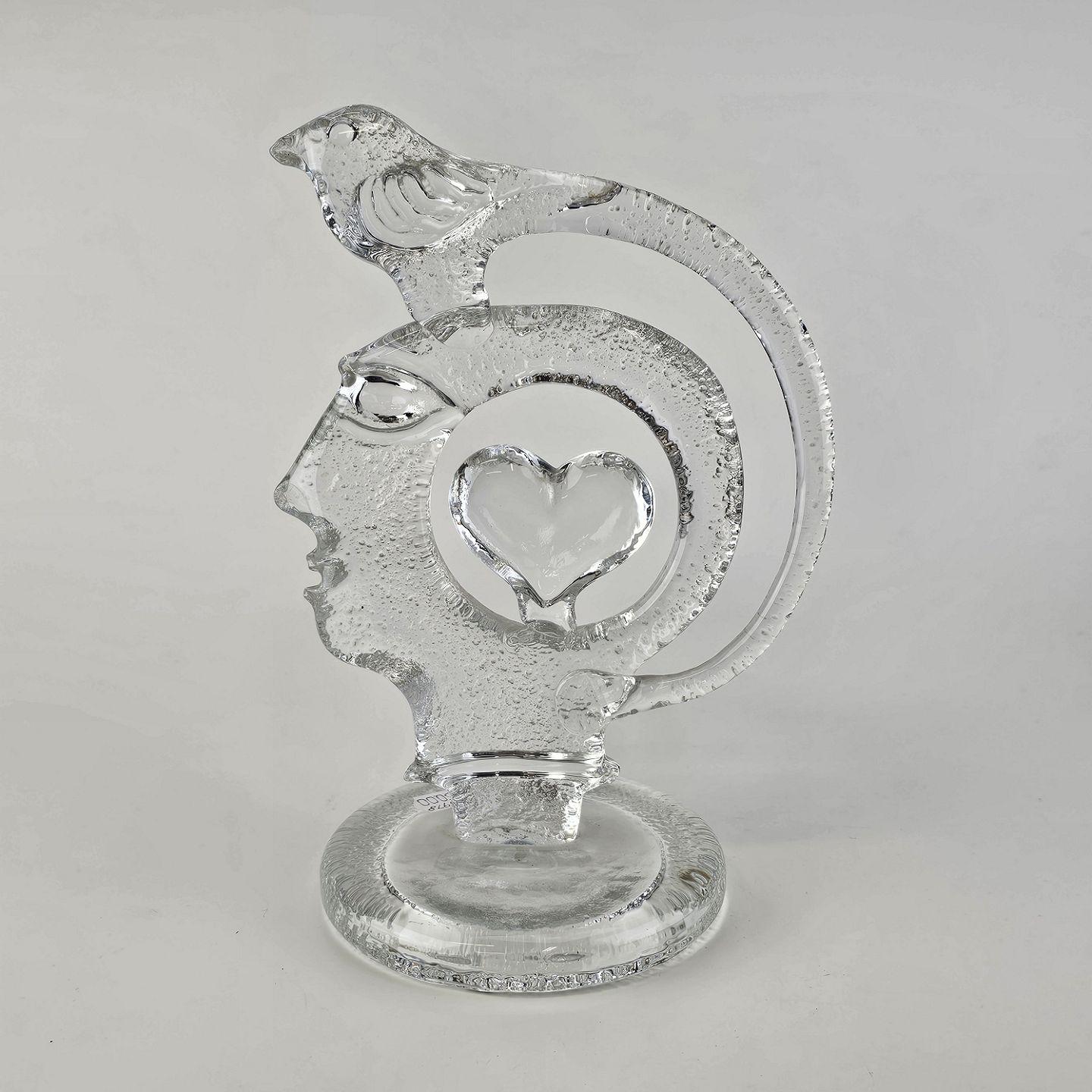 Skulptur i glas med motiv af et menneske i profil, en fugl og et hjerte
