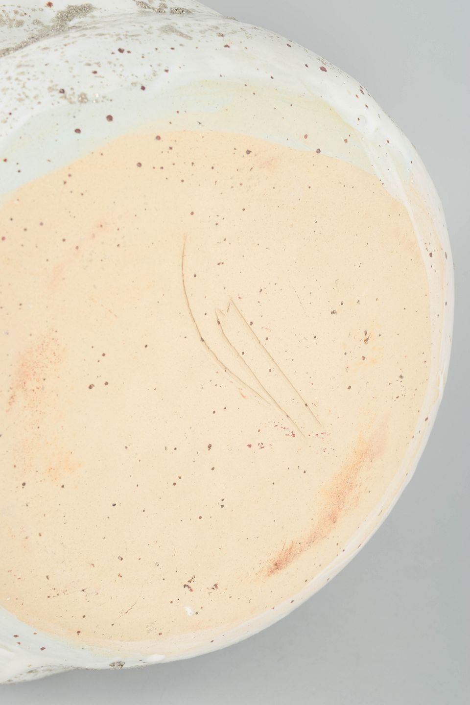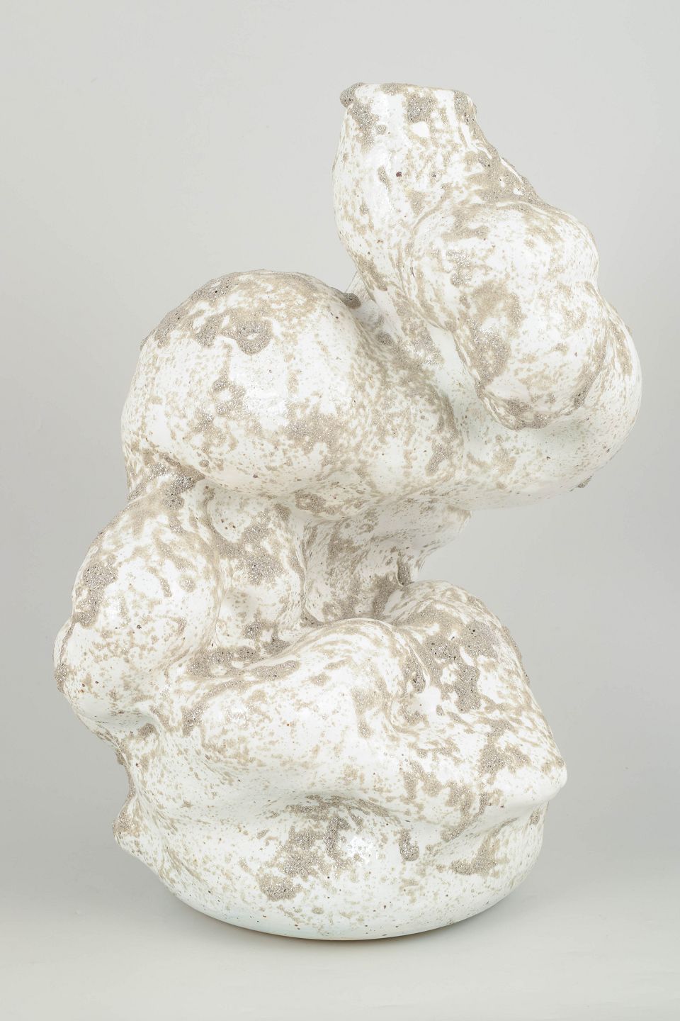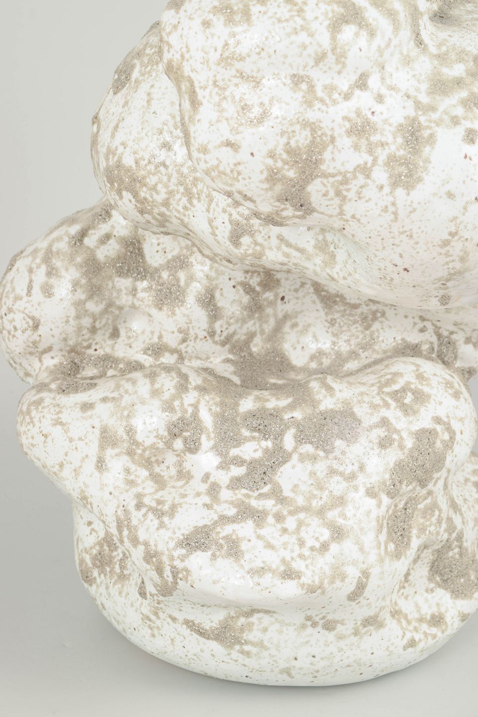 Christina Muff, Danish contemporary ceramicist (b. 1971). Large hand modeled, organic shaped, stoneware vessel. The glaze is glossy white with splashes of grey, matte glitter, lending a resemblence to wet sand. This piece is from Christina Muff's 'Helium' series.