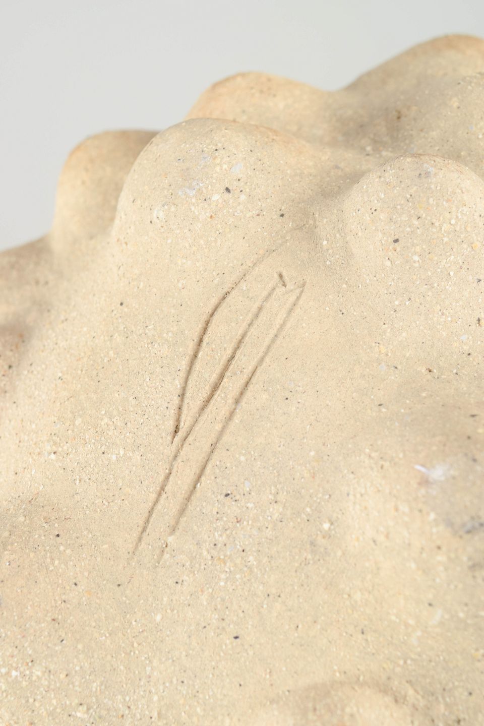 Christina Muff handcrafts her clay sculptures using techniques such as slab building and coiling. Large surfaces of clay are slowly shaped into detailed sculptures with complex, naturalistic forms. It is a time-consuming process, as the sculptures—due to their size—require a long drying period before being fired, often multiple times, to achieve the desired texture and color. During the glazing process, she uses a variety of techniques in combination with natural materials such as sand, chalk, and locally dug clay from Denmark. The goal is to create textures and surfaces that resemble man-made objects reclaimed by nature.