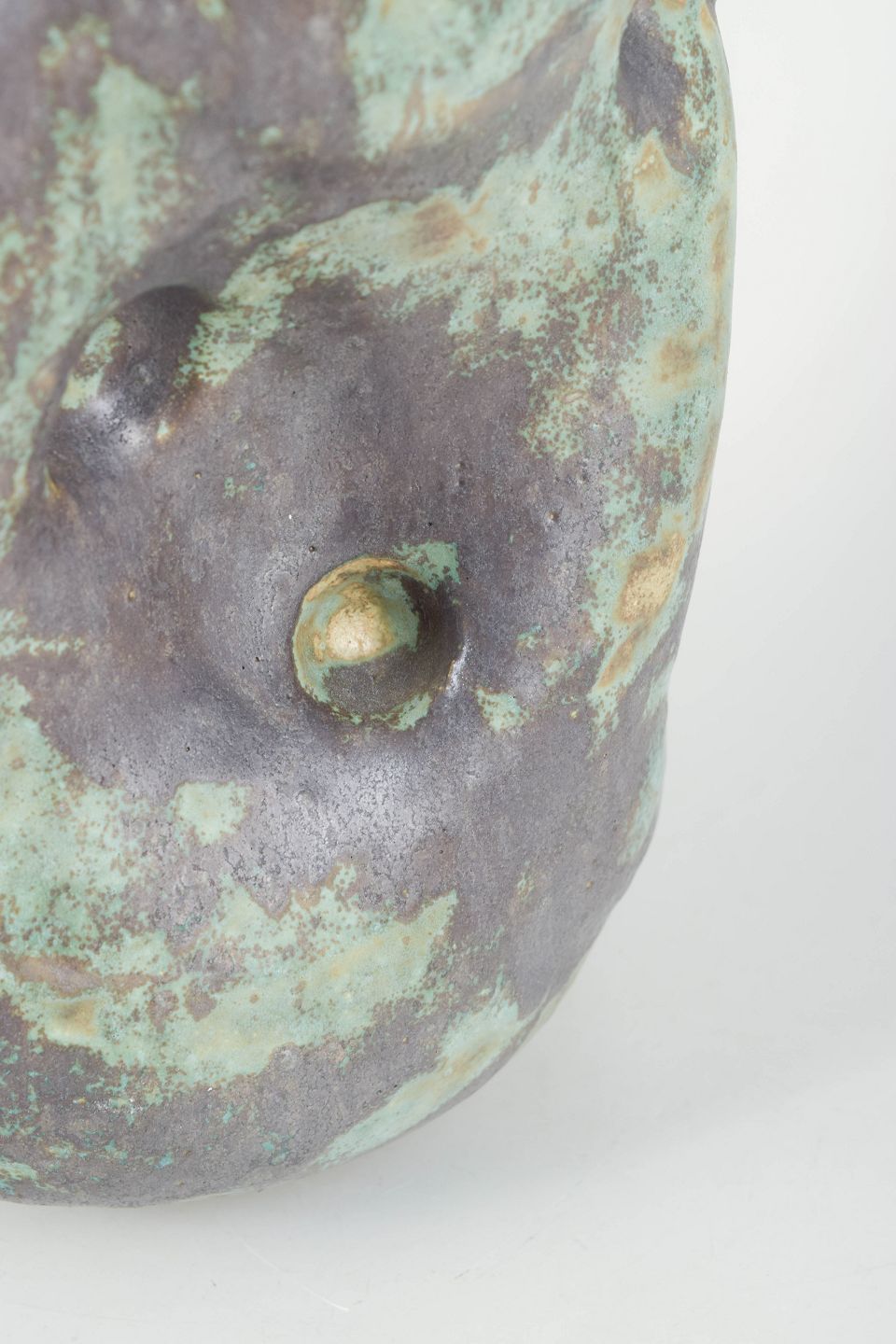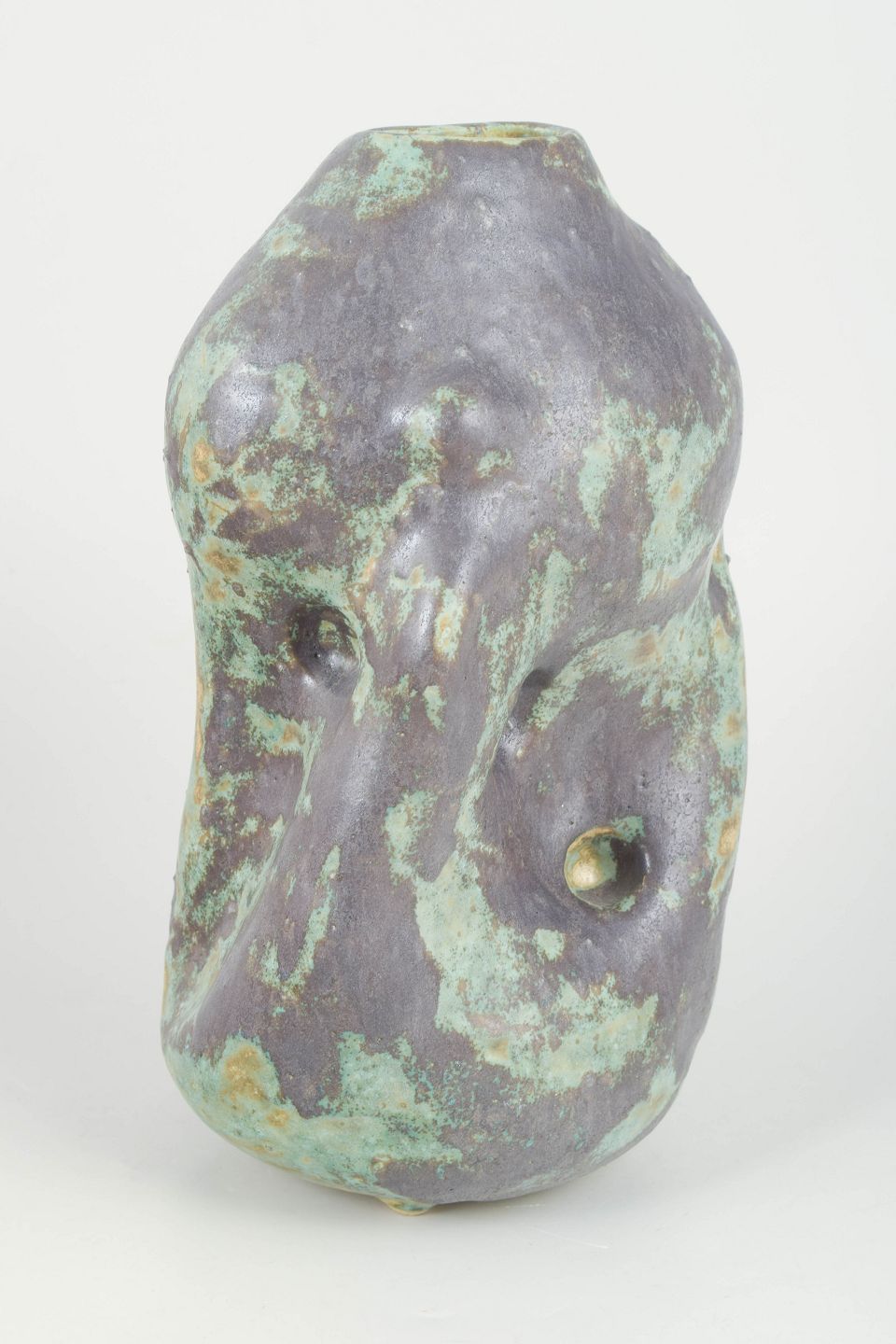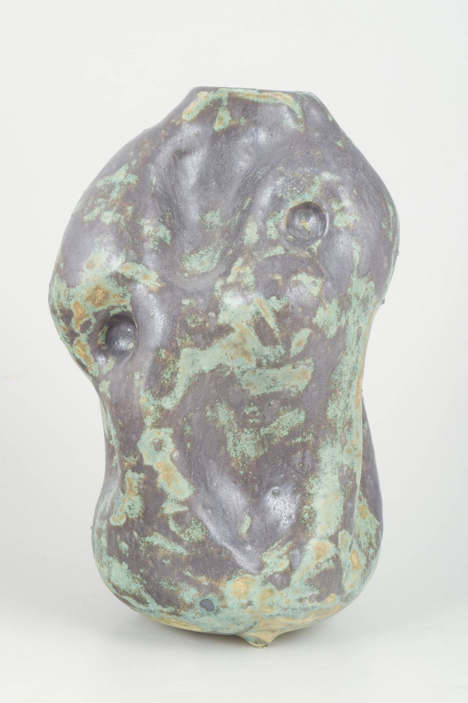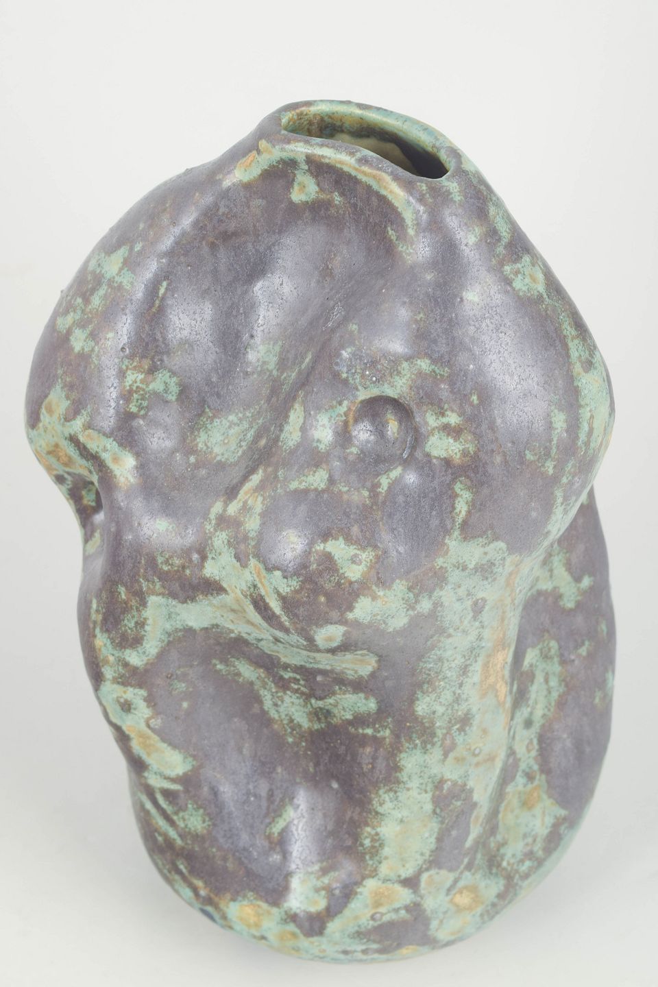 Large hand modeled, organic shaped, vessel. The vessel is covered in a copper green and black matte glaze.