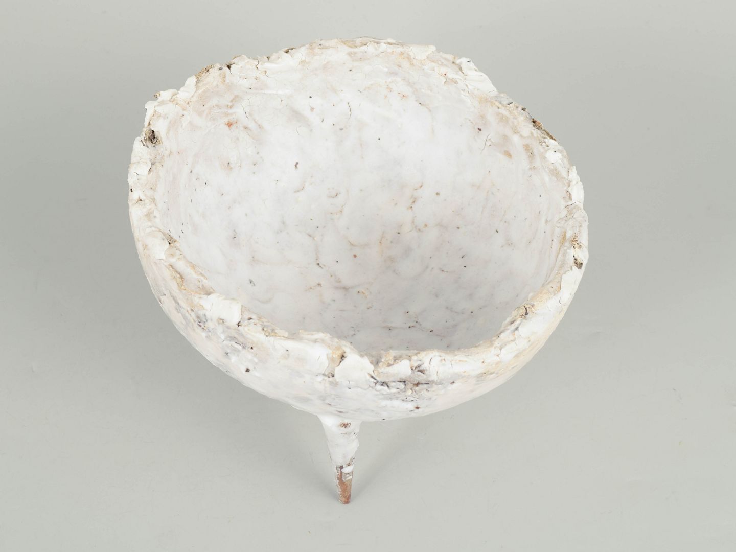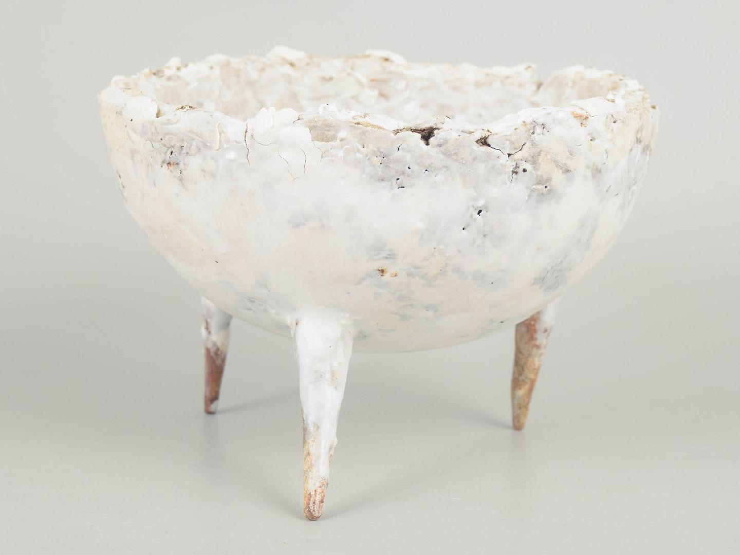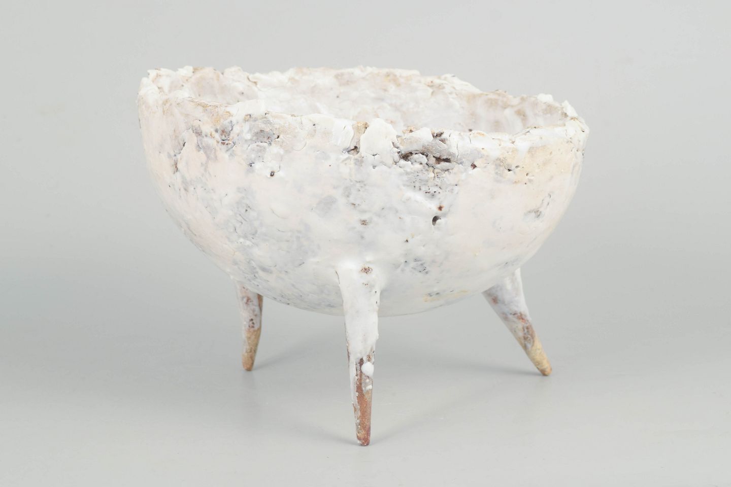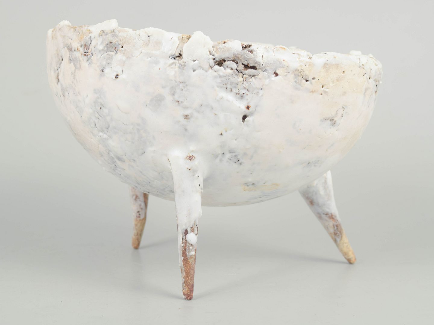 One of a kind stoneware bowl on three pointed legs. Reused clay. Partially glazed it shows the colours white, brown and cream.