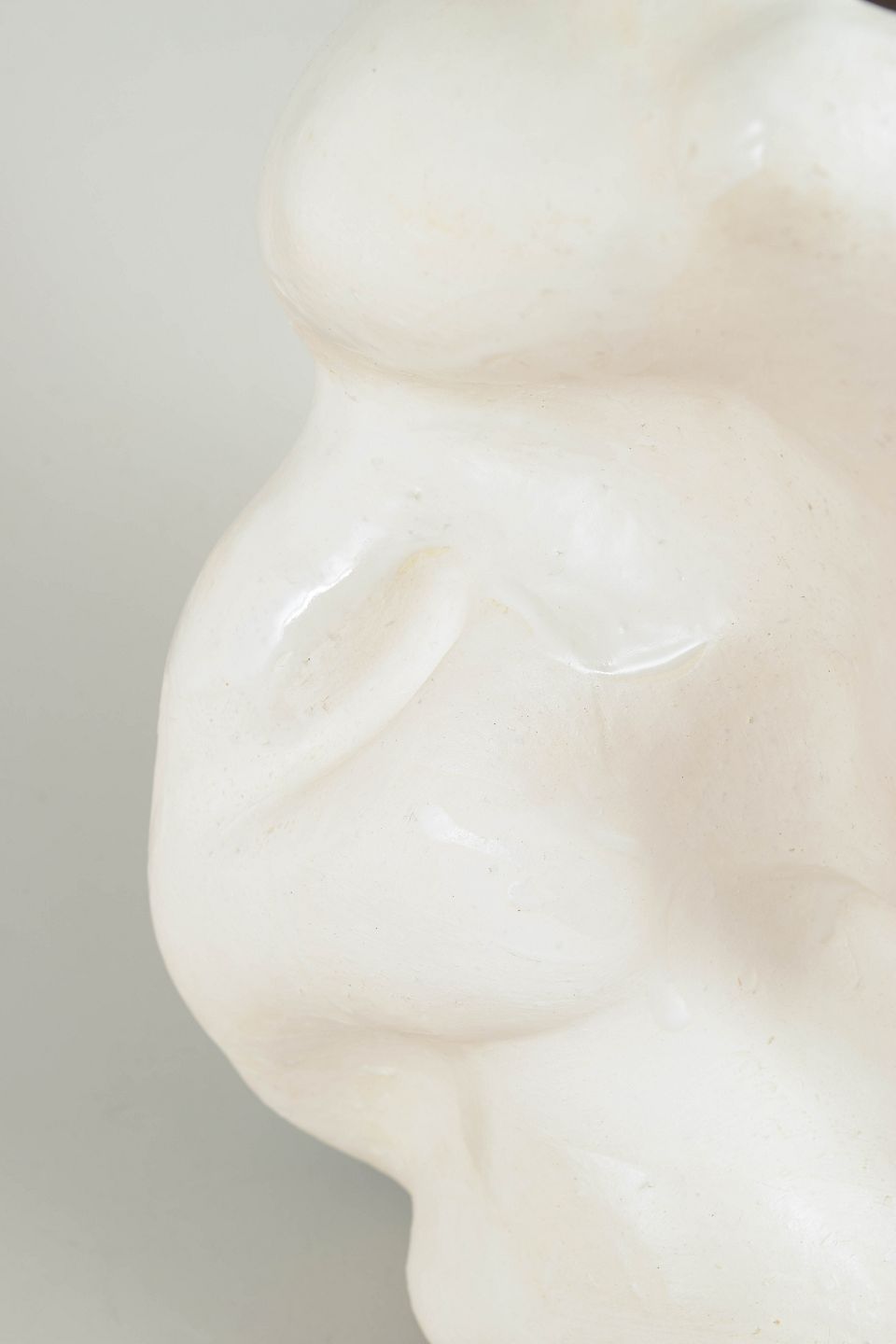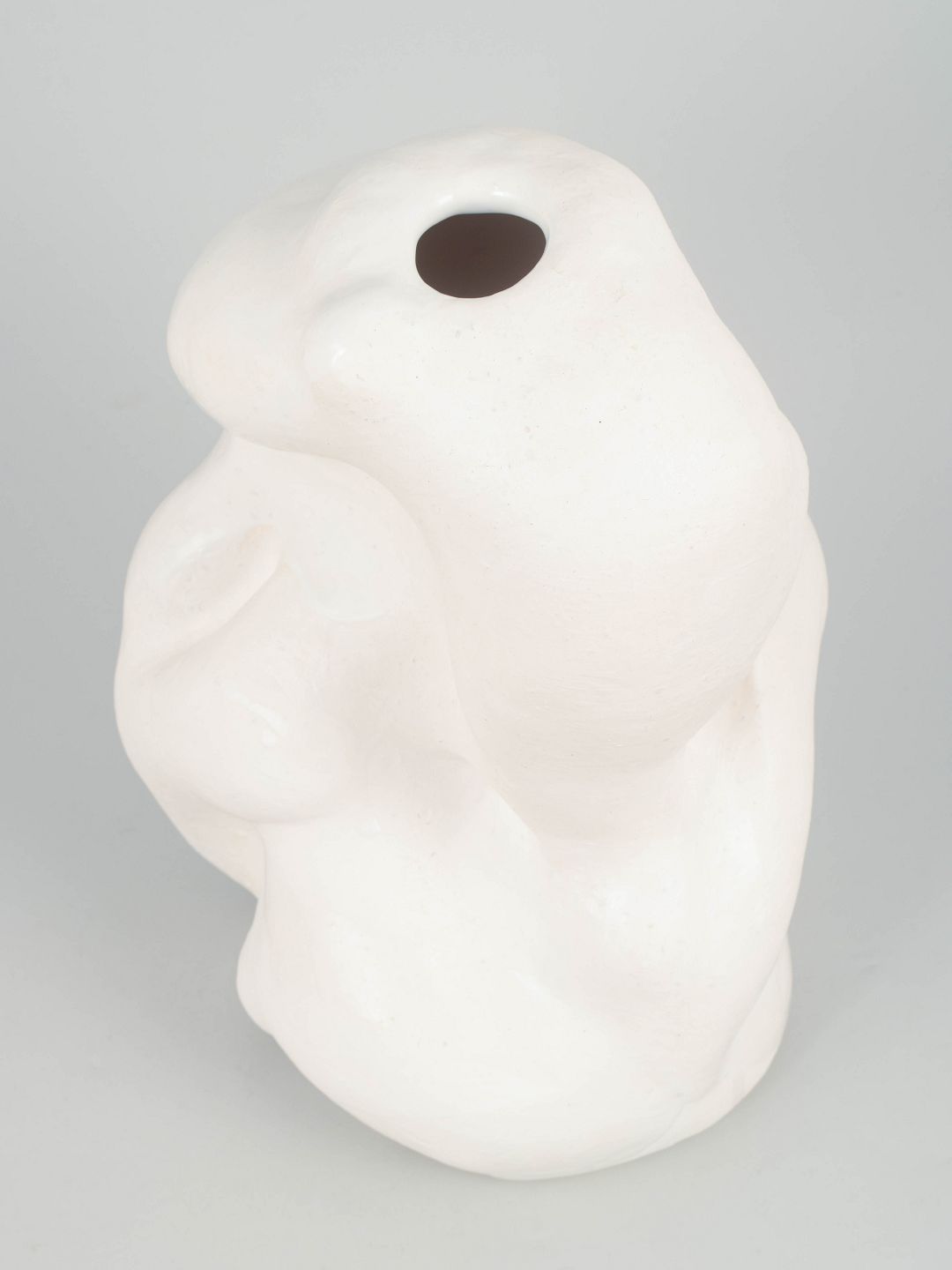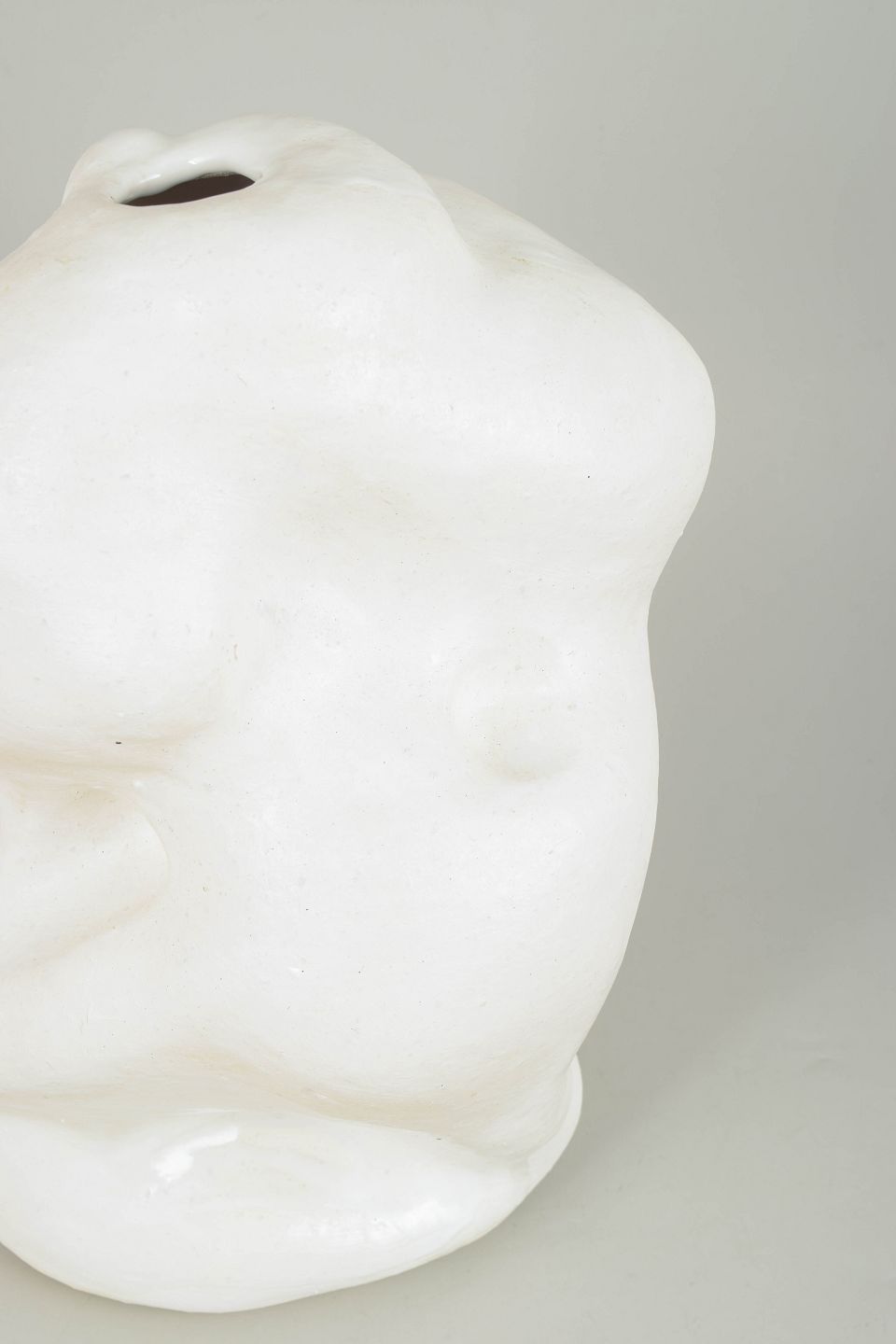Large hand modeled, organic shaped, stoneware vessel. This piece is covered in a thin layer of white, matte porcelain and areas with glossy white glaze. This piece is from Christina Muff's 'Helium' series.