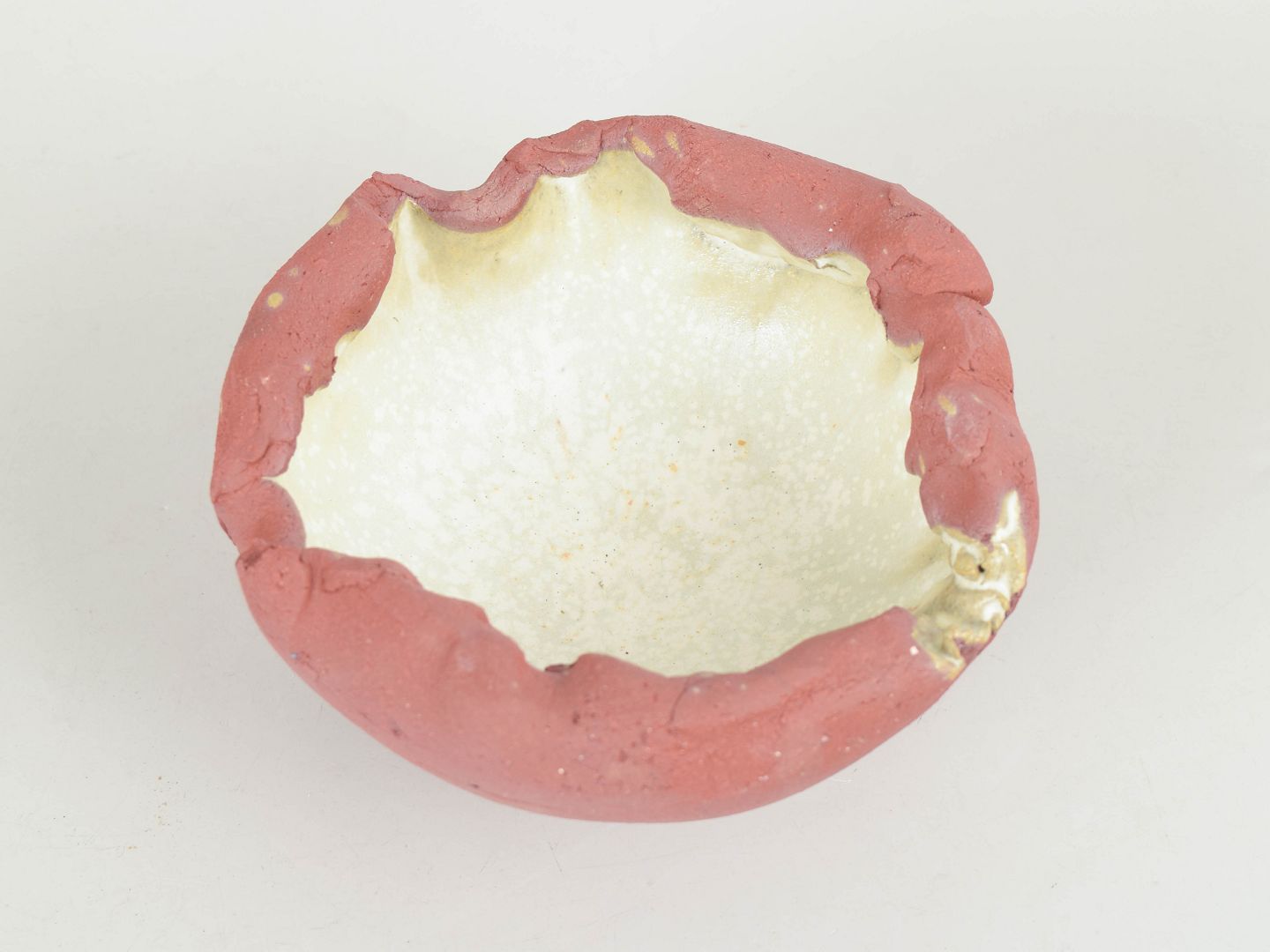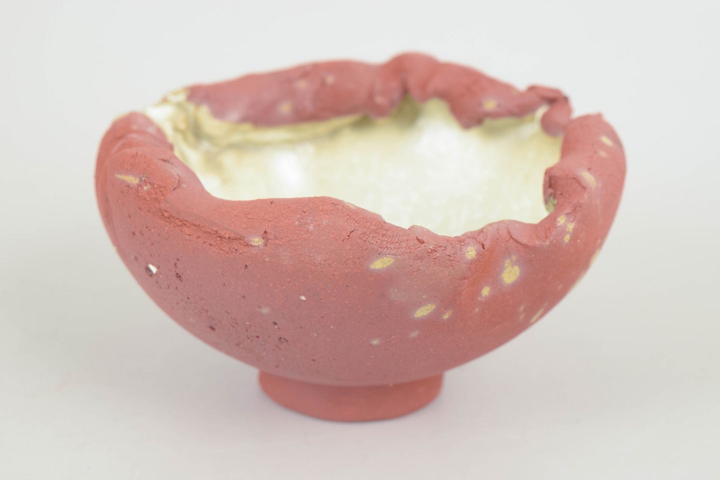 Small, one of a kind red stoneware bowl on foot. Unglazed on the outside the beautiful red clay contrasts the interior which is glazed in a creamwhite matte crystal glaze.