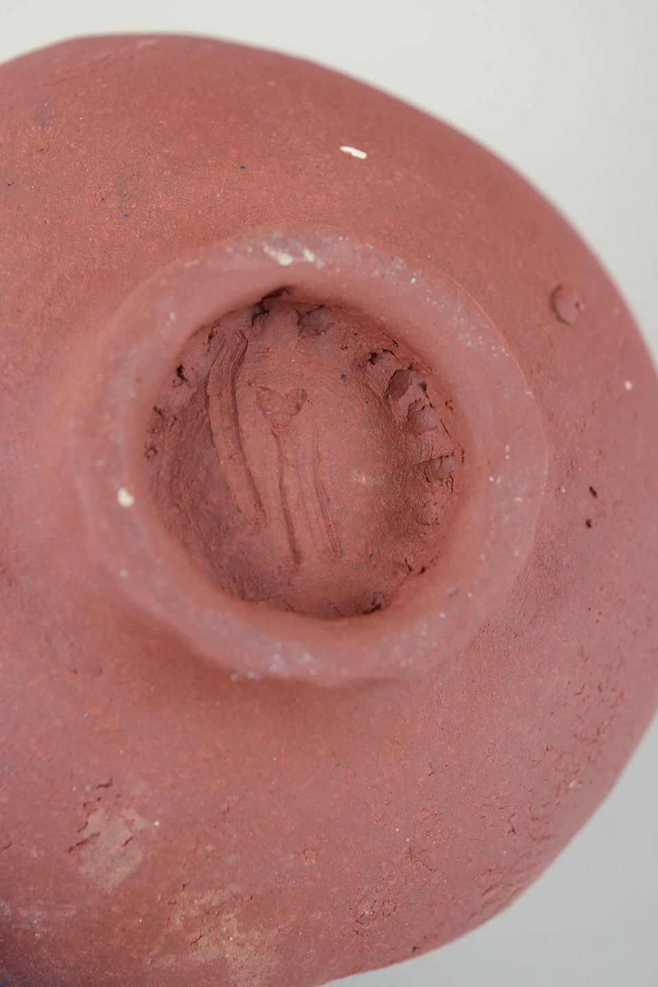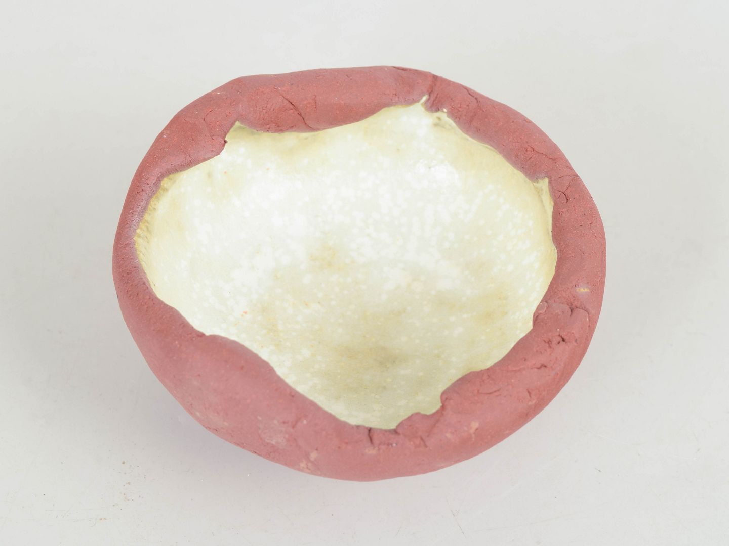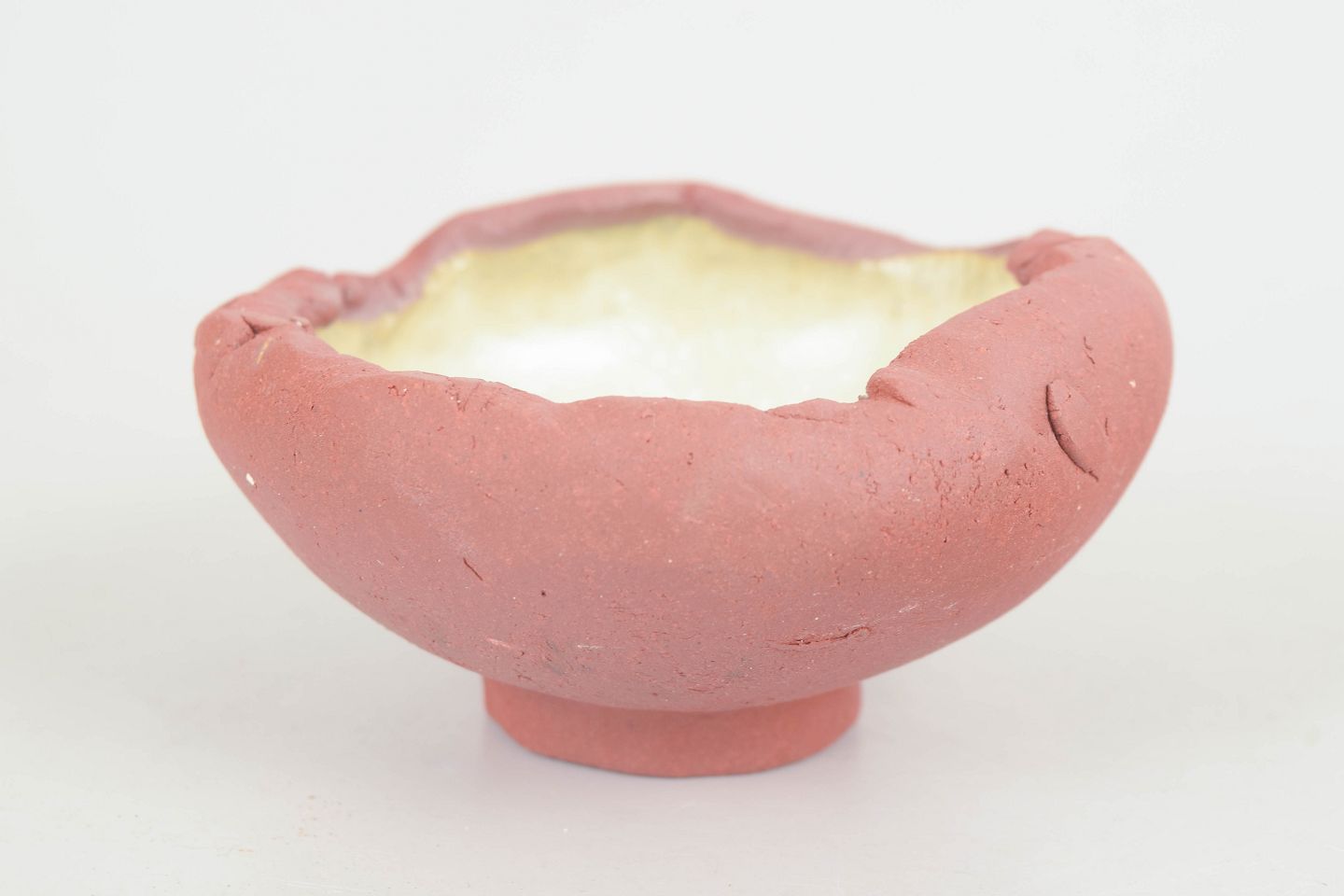 Tiny, one of a kind red stoneware bowl on foot. Unglazed on the outside the beautiful red clay contrasts the interior which is glazed in a creamwhite crystal glaze.
