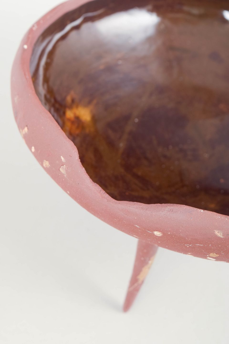 One of a kind red stoneware bowl on three pointed legs. unglazed on the outside the beautiful red clay compliments the interior which is covered in a dark celadon glaze.