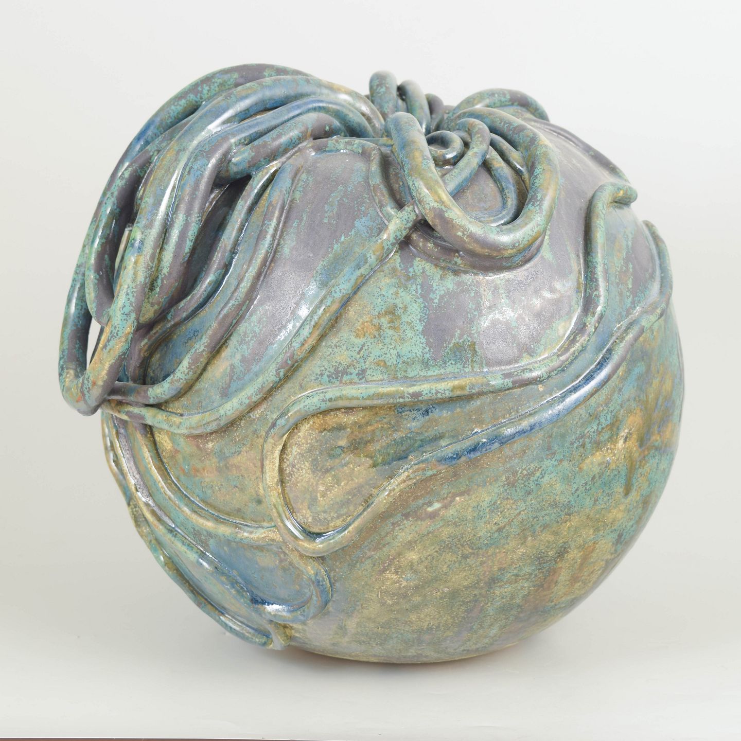 Very large stoneware vessel. The glaze is greenish turqouise with black and golden hues.