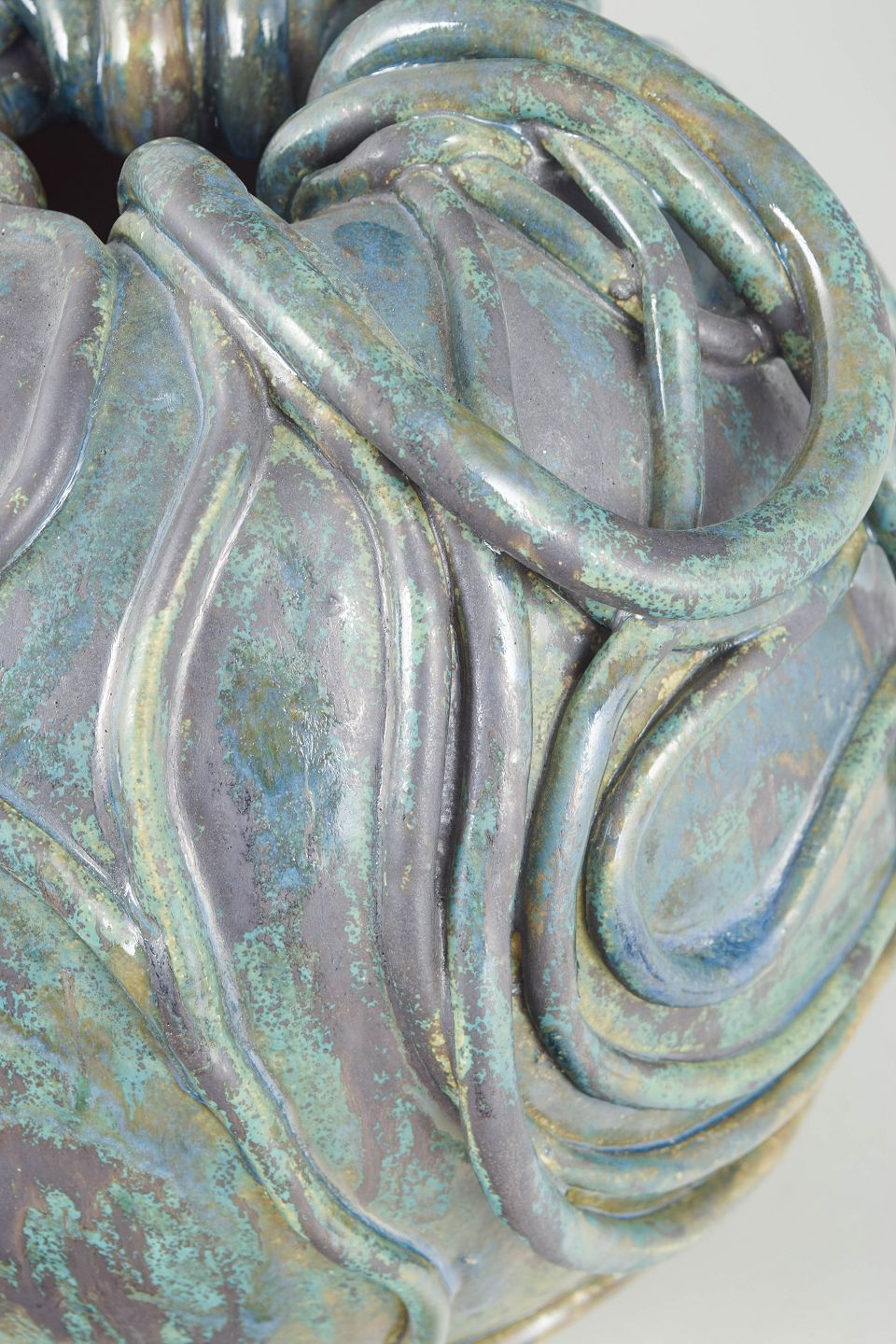 Christina Muff handcrafts her clay sculptures using techniques such as slab building and coiling. Large surfaces of clay are slowly shaped into detailed sculptures with complex, naturalistic forms. It is a time-consuming process, as the sculptures—due to their size—require a long drying period before being fired, often multiple times, to achieve the desired texture and color. During the glazing process, she uses a variety of techniques in combination with natural materials such as sand, chalk, and locally dug clay from Denmark. The goal is to create textures and surfaces that resemble man-made objects reclaimed by nature.