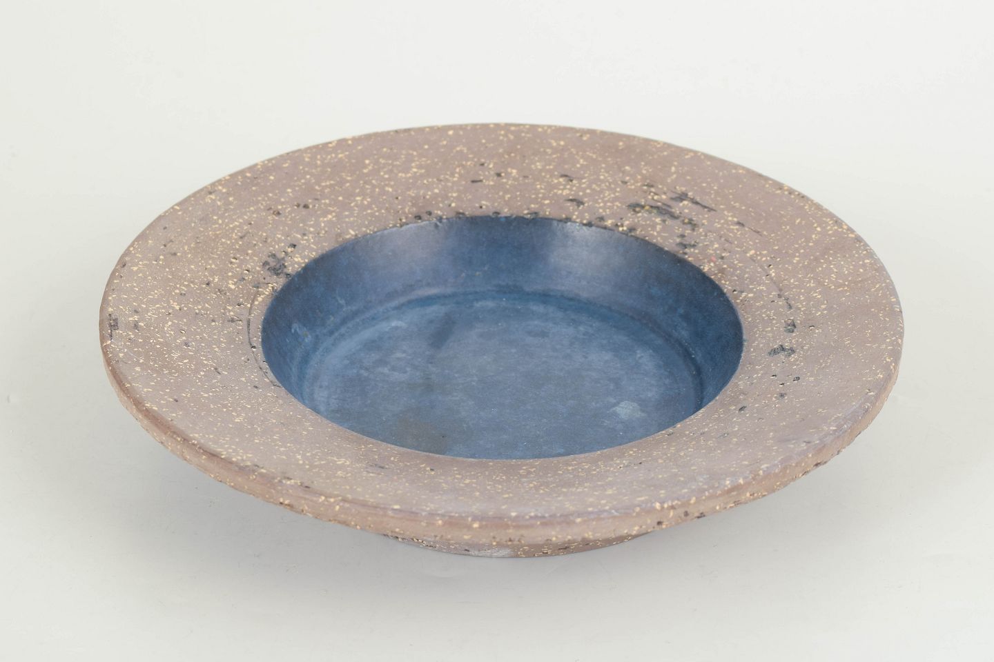 Decorative circular stoneware dish with matte glaze in blue and sandy tones with a speckled surface. Model 4070B.