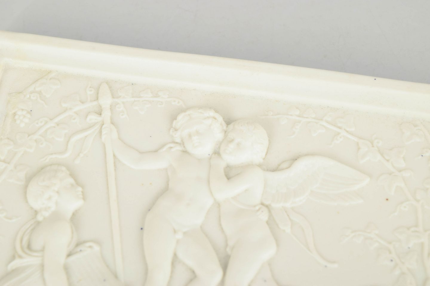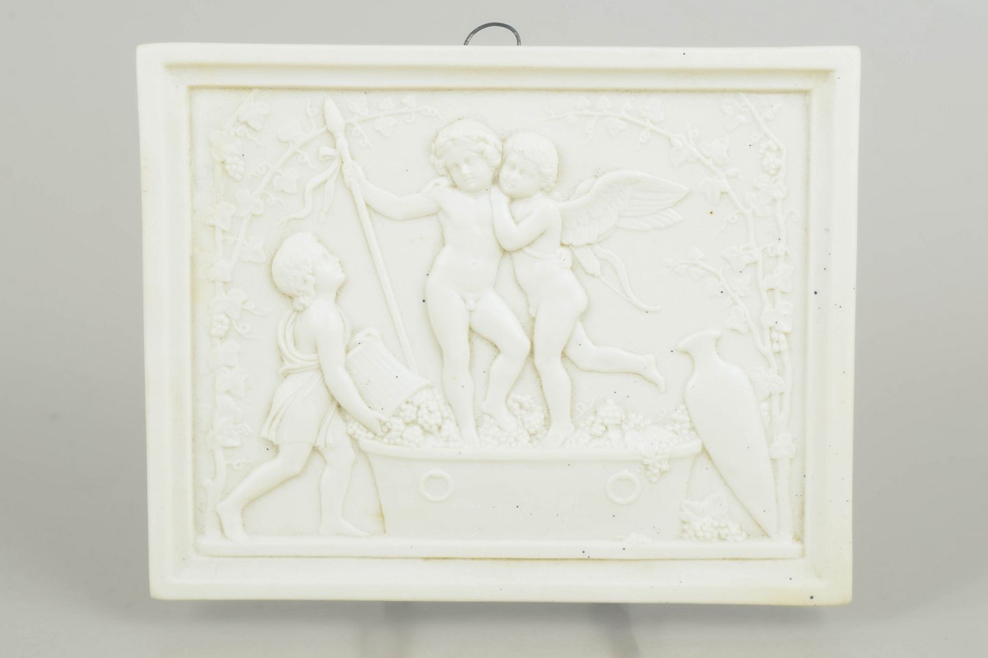 Rectangular wall relief in white biscuit porcelain depicting a classical composition with putti after Bertel Thorvaldsen, executed with refined detailing and soft modelling in the neoclassical style.