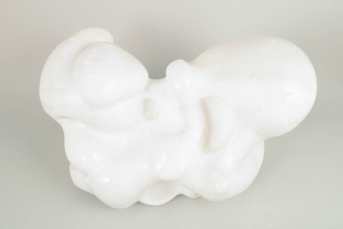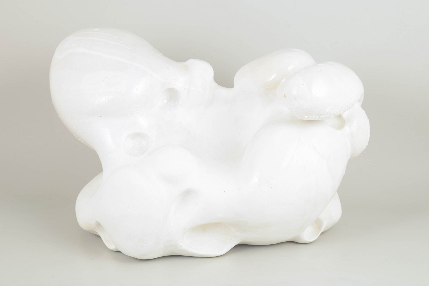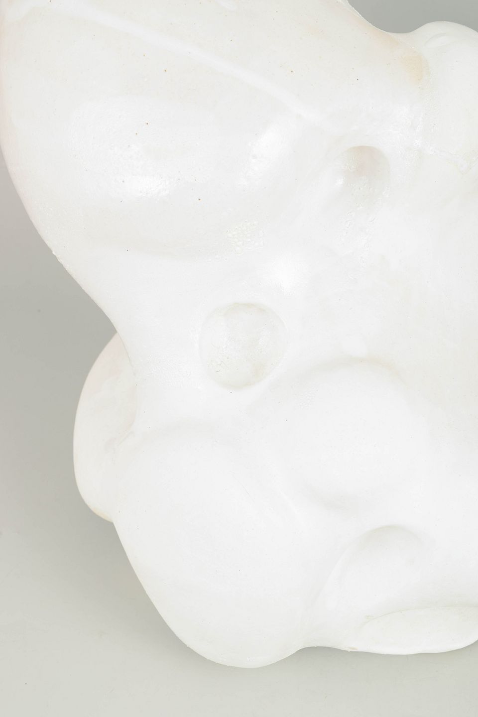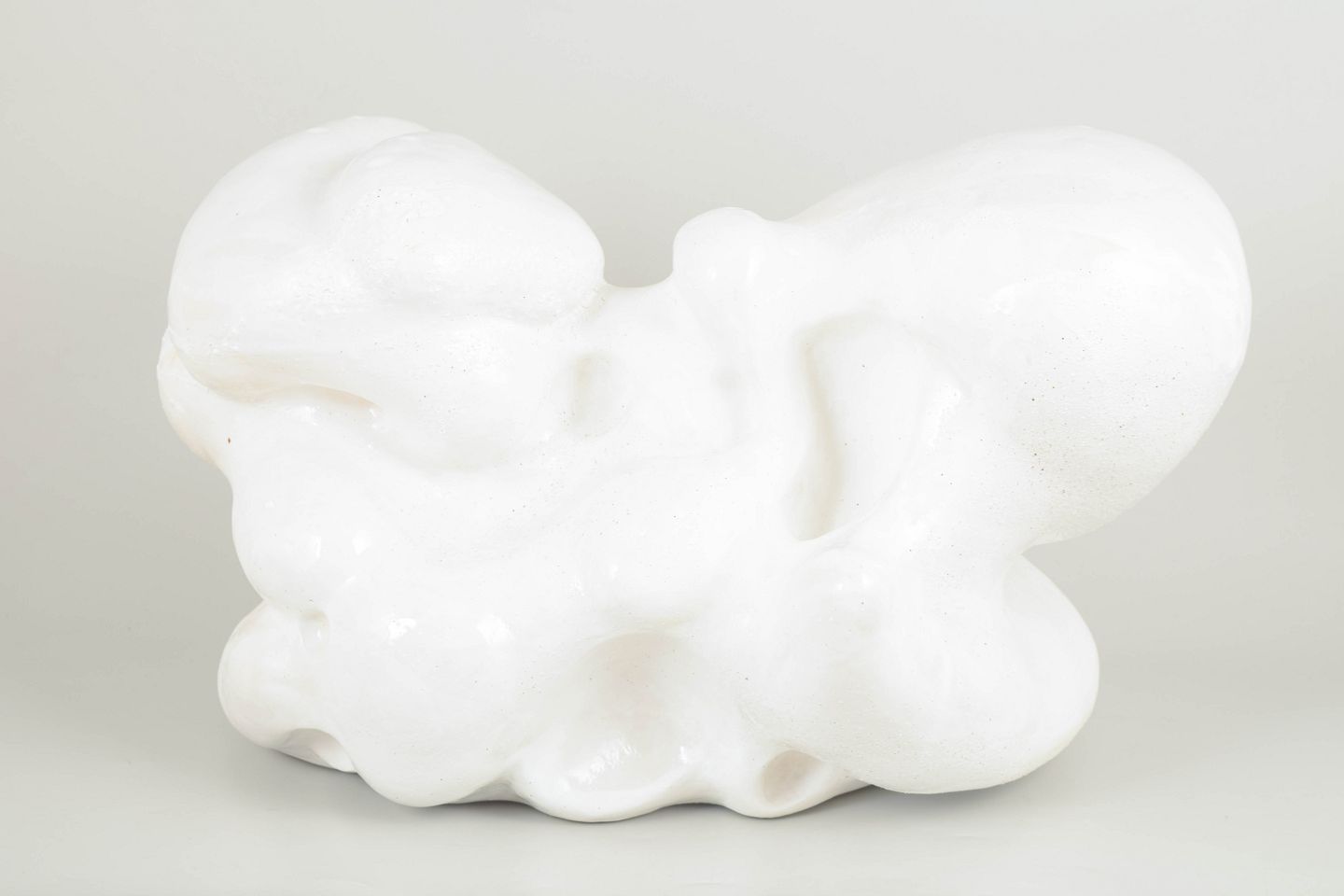 Large hand modeled, organic shaped, stonewaresculpture. This piece is covered in a thin layer of white, matte porcelain and areas with glossy glaze, matte glaze and white glazes with special effects, all white.