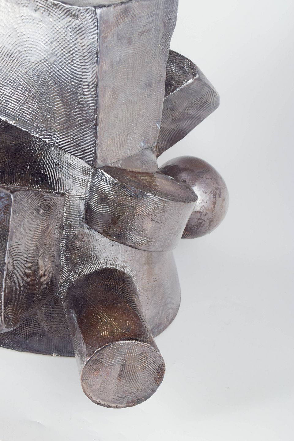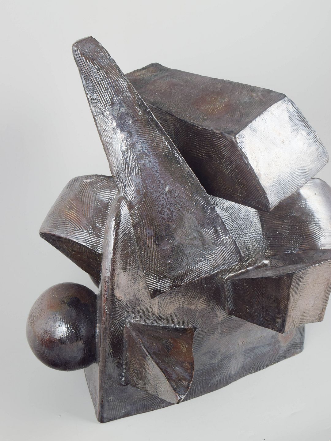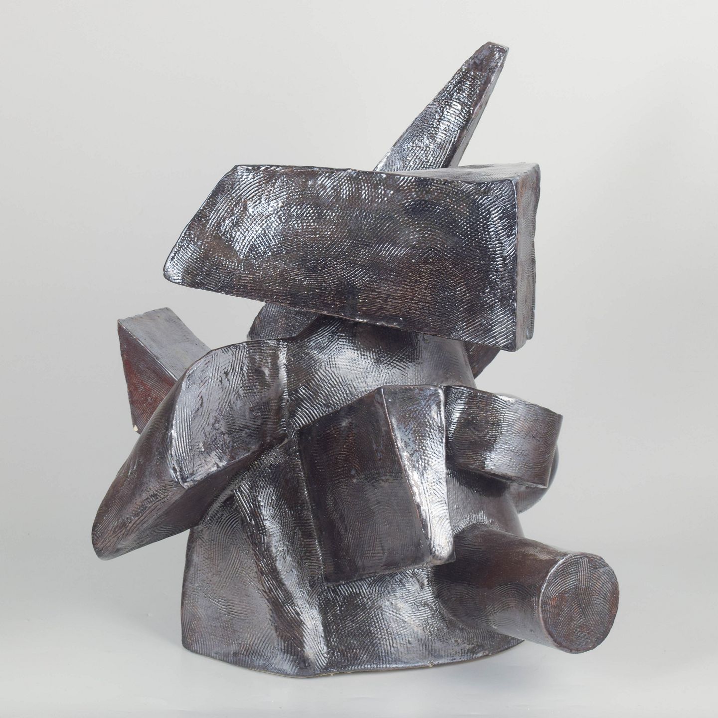 Monumental sculpture, cubistic style. The stoneware surface is covered in a greyish black, almost metallic glaze.